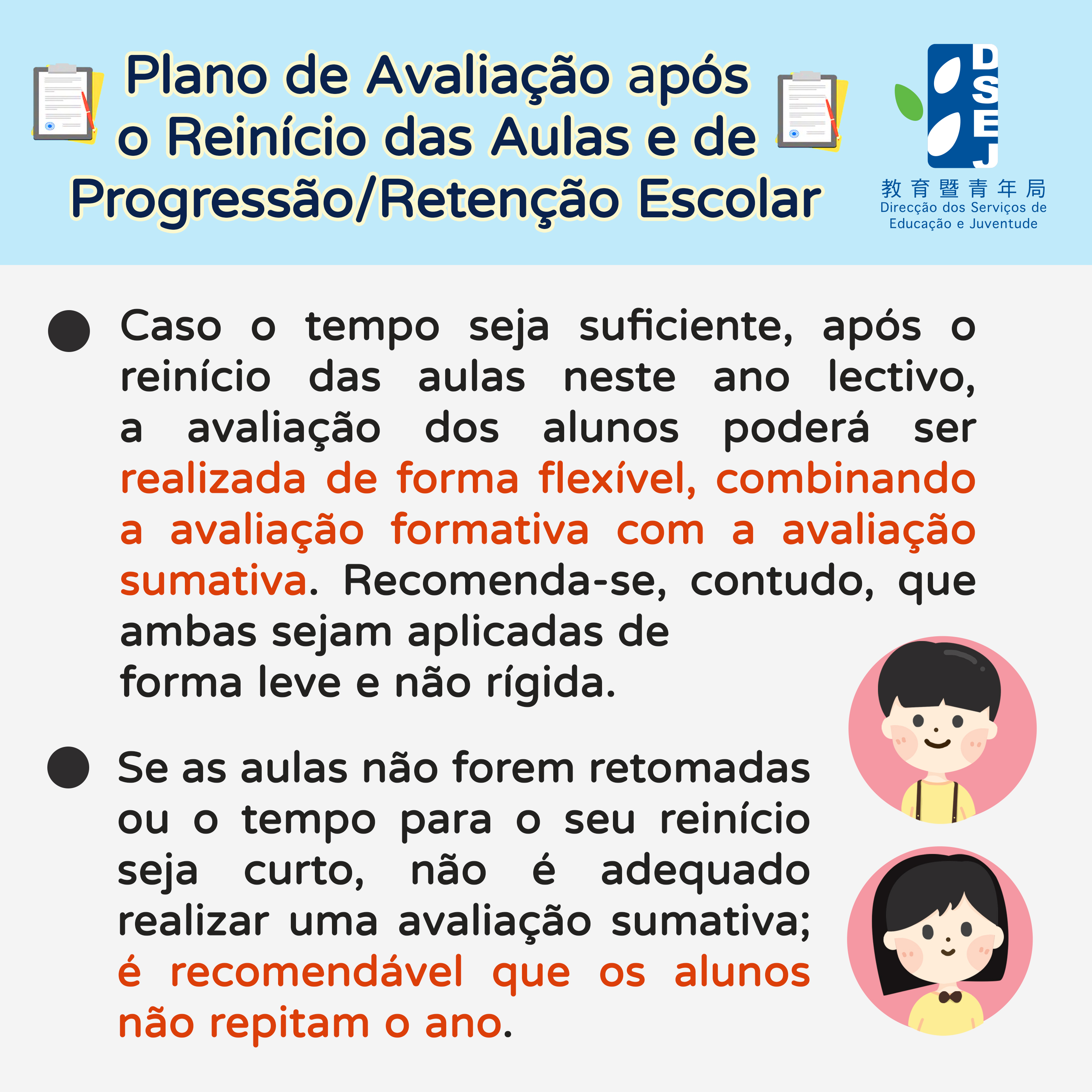 • Plano de Avaliação após o Reinício das Aulas e de Progressão/Retenção Escolar