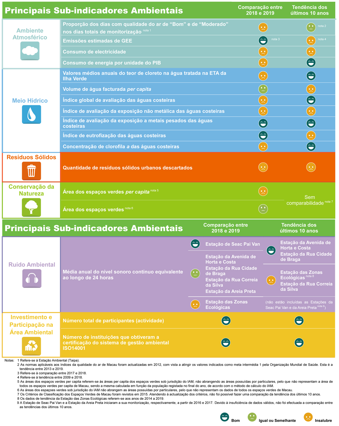 Comparando os valores de 2019 com os de 2018, a área dos espaços verdes sob jurisdição do IAM é semelhante e a área dos espaços verdes per capita desceu ligeiramente. Em 2019, aumentou significativamente o número total de participantes e das actividades das acções de sensibilização e divulgação ambiental realizadas pela DSPA e pelo IAM, face a 2018.