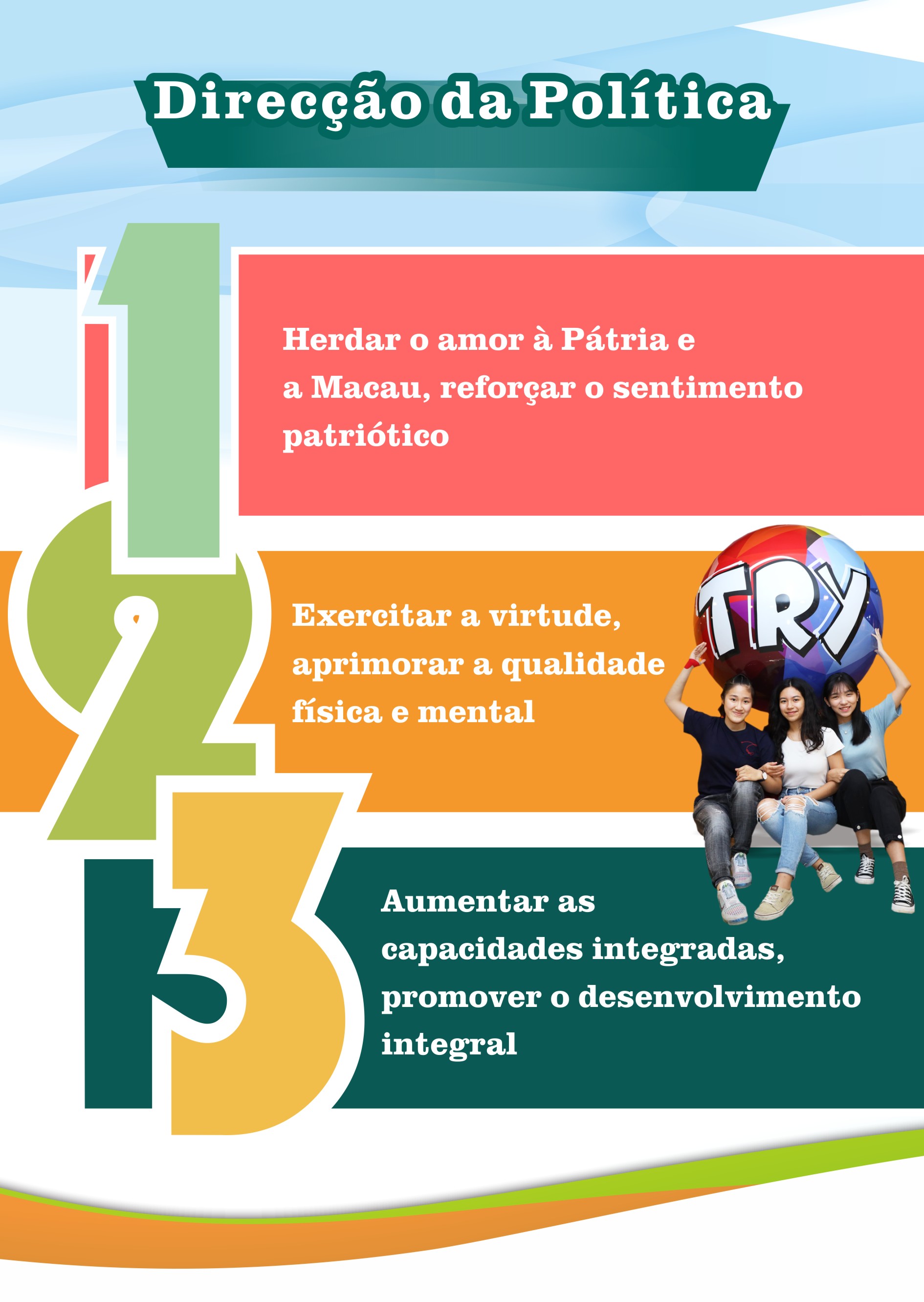 A nova Política de Juventude tem o prazo de 10 anos e passará a abranger jovens com idades entre os 13 e os 35 anos, quando antes abrangia as idades entre os 13 e os 29 anos, com vista a articular-se com as Políticas de Juventude do País e das diversas cidades da Grande Baía Guangdong-Hong Kong-Macau. A nova Política de Juventude tem como perspectivas a “formação de boas condições físicas e psicológicas, desenvolvimento de valores morais dignos e talento, manifestação da coragem de assumir as responsabilidades e construção do futuro”. Com os esforços envidados pelo Governo e os diversos sectores da sociedade, a actual Política de Juventude conseguiu criar um bom ambiente para o crescimento dos jovens. No futuro, para além de continuar a acompanhar a formação de valores morais dignos, a saúde física e psicológica e as capacidades integrais dos jovens, a Política de Juventude dará ainda maior importância à formação para a conscientização dos tempos e da assunção das responsabilidades nos jovens. A Política de Juventude enquadra 5 grandes direcções, nomeadamente, “Herdar o amor à Pátria e a Macau, reforçar o sentimento patriótico”, “Exercitar a virtude, aprimorar a qualidade física e mental”, “Aumentar as capacidades integradas, promover o desenvolvimento integral”, “Construir, em conjunto, uma atmosfera harmoniosa, criar uma sociedade inclusiva” e “Melhorar a participação social, participar no desenvolvimento do País” e, ainda, 10 medidas fundamentais, designadamente, “Reforçar a educação do amor pela Pátria e aumentar o sentimento patriótico”, “Fortalecer a educação moral e promover uma vida saudável”, “Melhorar as qualidades globais e reforçar as competências essenciais” “Reforçar o cultivo de talentos e promover o desenvolvimento diversificado”, “Intensificar o intercâmbio com o exterior e expandir o espaço para o desenvolvimento”, “Reforçar o intercâmbio e criar um ambiente positivo”, “Promover a inclusão social e garantir a igualdade de oportunidades”, “Apoiar o associativismo juvenil e realçar a força das associações”, “Cultivar a consciência para a participação na sociedade e o interesse pelo desenvolvimento social” e “Garantir o investimento em recursos e integrar diferentes tipos de recursos”. Promove, igualmente, o desenvolvimento integral dos jovens, ajuda-os a incluírem-se na cooperação inter-regional e no desenvolvimento nacional, a par de reforçar as suas experiências e a consciência para a assunção das responsabilidades, com vista a permitir que desenvolvam as suas potencialidades e contribuam para a sociedade.
