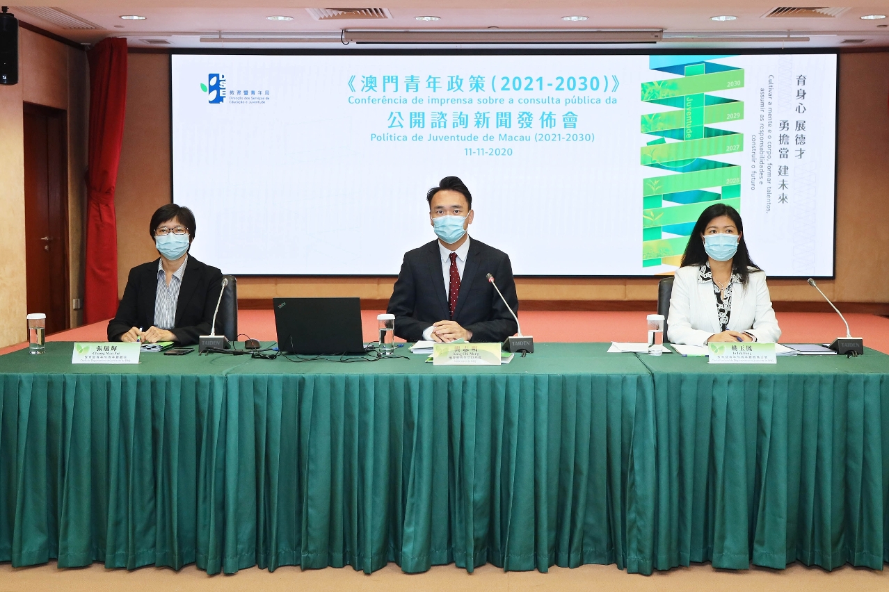 O Governo da RAEM promulgou e implementou, em 2013, a Política de Juventude de Macau (2012 – 2020), ainda vigente, que contempla quatro direcções fundamentais: “promoção da participação social”, “estimular o crescimento físico e mental”, “criação de uma atmosfera afectuosa” e “promoção da mobilidade social”. Esta política veio definir o eixo principal dos trabalhos na área da juventude de Macau, conjugar os esforços da sociedade e promover o desenvolvimento integral dos jovens. Este ano, sendo o ano da conclusão da aludida política, com a finalidade de aperfeiçoar, continuadamente, o sistema de trabalhos na área da juventude e delinear um novo plano de trabalhos, a médio e longo prazo, a Direcção dos Serviços de Educação e Juventude (DSEJ) responsabilizou-se pela coordenação do grupo de acompanhamento interdepartamental da Política de Juventude e, após auscultar as opiniões do Conselho de Juventude e proceder à troca de ideias com mais de cem entidades governamentais, associações, instituições educativas e escolas, elaborou o documento de consulta para a Política de Juventude de Macau (2021 – 2030), cuja consulta pública terá lugar entre 12 de Novembro e 11 de Dezembro de 2020.