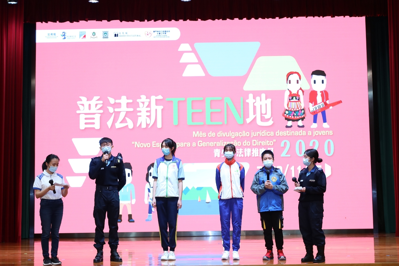 De forma a divulgar os conhecimentos jurídicos, continuamente, junto dos jovens e reforçar a sua consciência para o conhecimento e cumprimento da lei, o grupo de acompanhamento interdepartamental da “Política de Juventude”, constituído por sete serviços governamentais, nomeadamente, a Direcção dos Serviços de Educação e Juventude (DSEJ), a Direcção dos Serviços de Assuntos de Justiça (DSAJ), a Direcção dos Serviços para os Assuntos Laborais (DSAL), o Corpo de Polícia de Segurança Pública (CPSP), a Polícia Judiciária (PJ), o Instituto Cultural (IC) e o Instituto de Acção Social (IAS), organizou, em Outubro de 2020, o mês da divulgação jurídica destinada a jovens, no âmbito da actividade “Novo Espaço para a Generalização do Direito”, que contou com a realização de 16 actividades temáticas sobre a divulgação das leis, que incluíram palestras, concurso de produção criativa de artigos promocionais, projecto do prémio de redacção, workshops para conhecer as cidades da Grande Baía, festival, entre outras, e contaram com 51.817 participações.