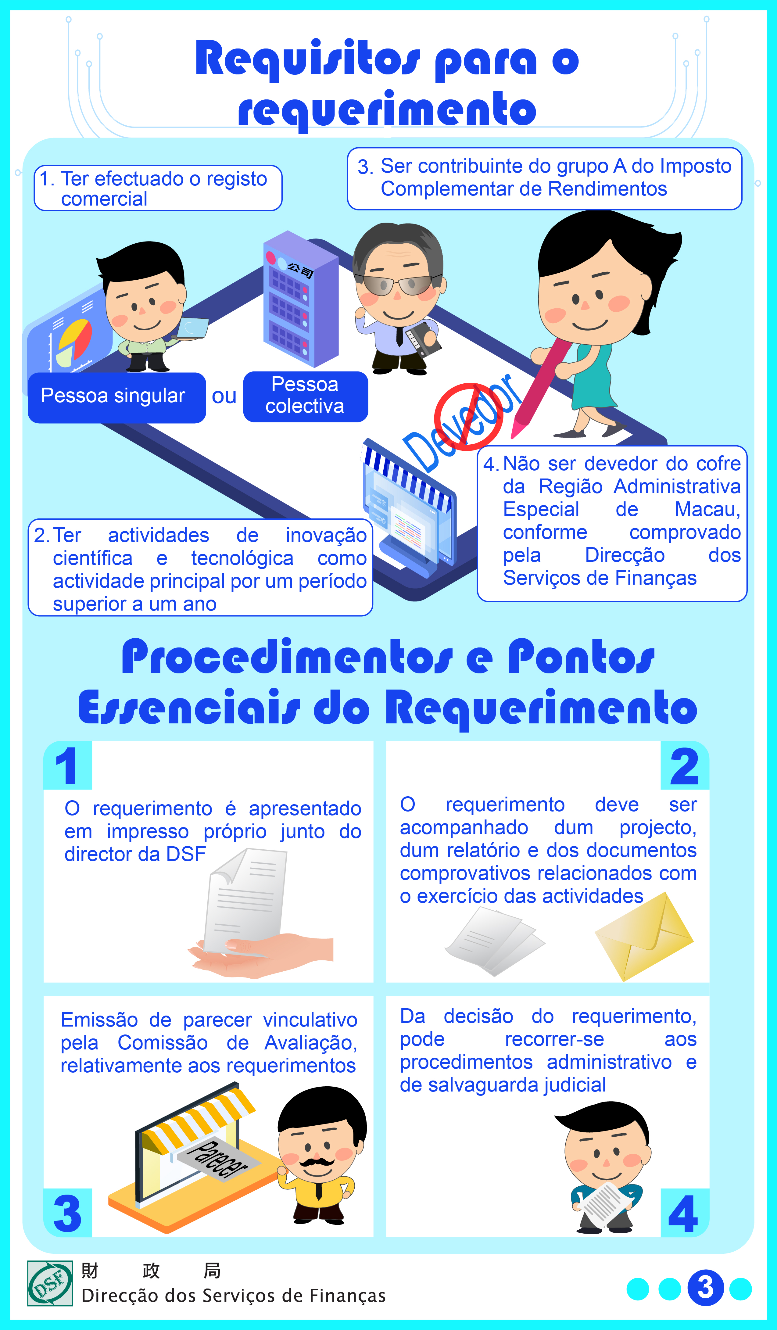 Podem apresentar à DSF o requerimento através do impresso próprio, todos os contribuintes do grupo A do imposto complementar de rendimentos que tenham efectuado o registo comercial, quer sejam pessoas singulares ou colectivas, desde que não sejam devedores ao cofre da RAEM, e a actividade principal exercida pela empresa tem de corresponder às actividades de inovação científica e tecnológica acima mencionadas por um período superior a um ano. Devem ser anexados ao requerimento o projecto, o relatório e os documentos comprovativos do exercício das actividades de inovação científica e tecnológica.