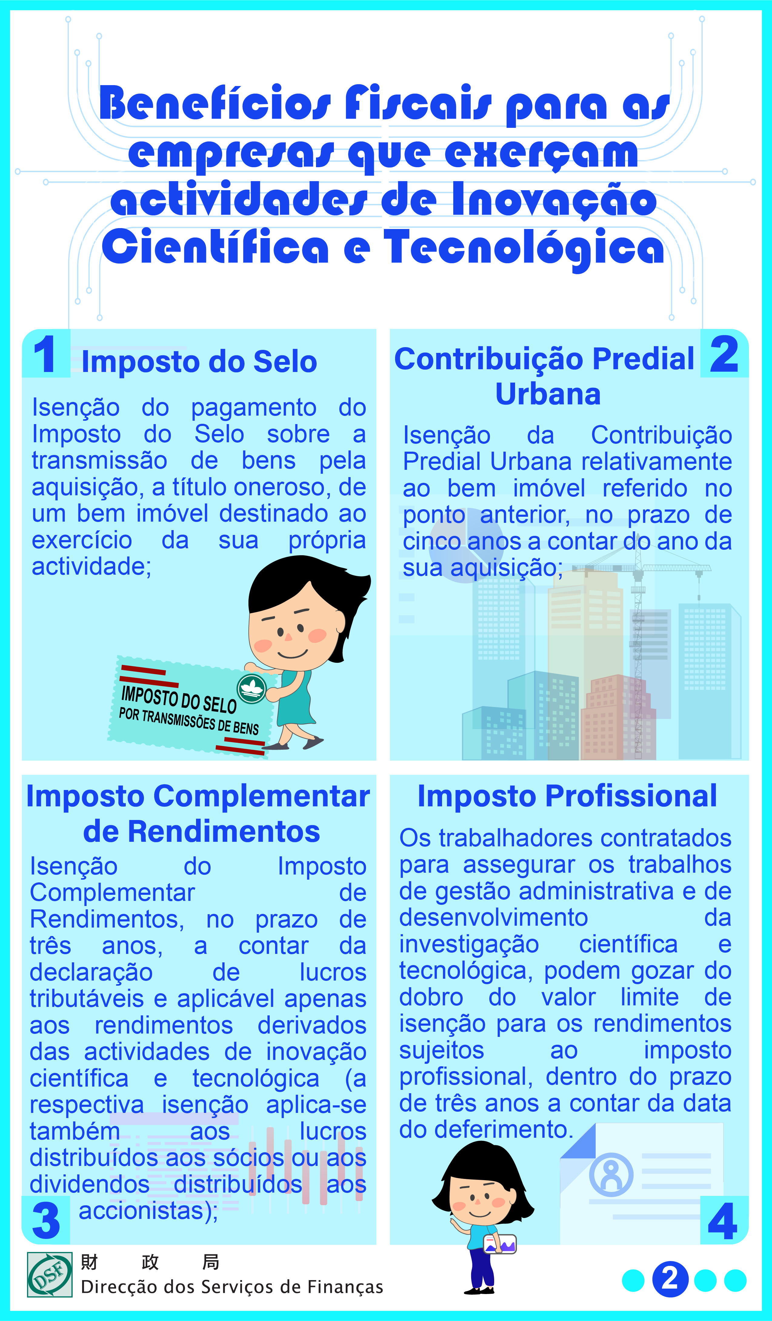 A fim de impulsionar a inovação na área tecnológica e construção de uma cidade inteligente e simultaneamente, em articulação com a implementação do plano de desenvolvimento da Grande Baía Guangdong - Hong Kong - Macau, promover o desenvolvimento da inovação científica e tecnológica na Região Administrativa Especial de Macau e fomentar a diversificação sectorial local adequada, o Governo de Macau lançou o “Regime de benefícios fiscais para as empresas que exerçam actividades de inovação científica e tecnológica” e a Direcção dos Serviços de Finanças vai começar a aceitar os requerimentos das empresas, a partir do dia 1 de Abril de 2021.