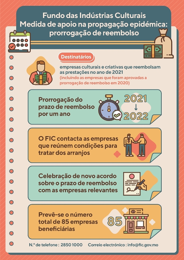 Para aliviar o impacto na economia derivado da pneumonia causada pelo novo tipo de coronavírus, o Fundo das Indústrias Culturais (FIC) implementa a segunda ronda de medida de apoio na propagação epidémica, com prorrogação de reembolso, para reduzir a pressão económica das empresas culturais e criativas, devido à desaceleração económica durante a disseminação epidémica.