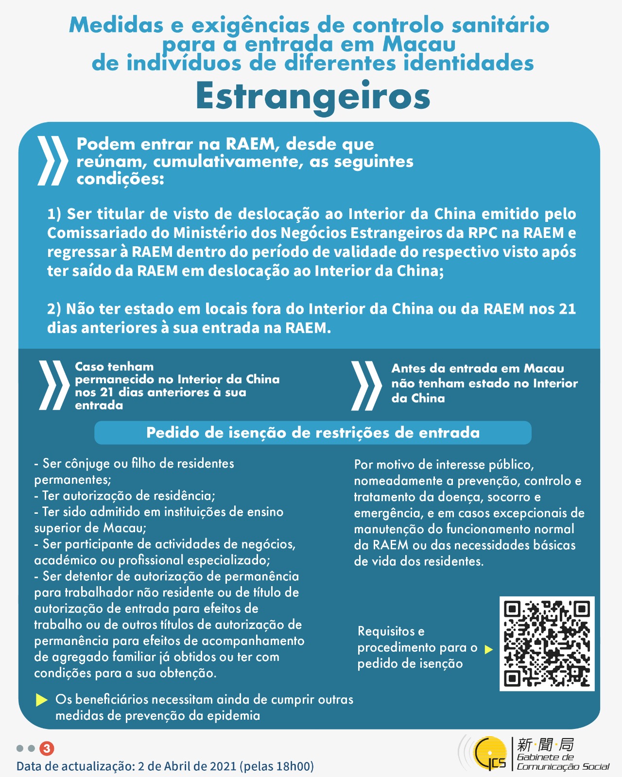 (Infografia)Medidas e exigências de controlo sanitário para a entrada em Macau de indivíduos de diferentes identidades, actualizadas no dia 2 de Abril de 2021