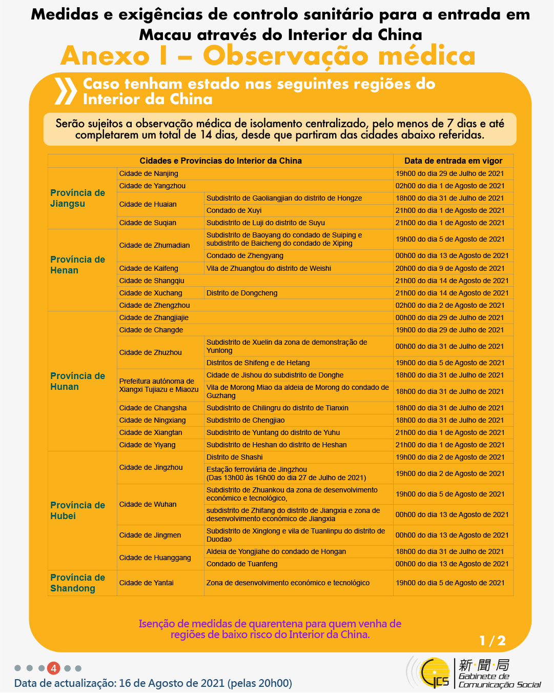 (Infografia)Medidas e exigências de controlo sanitário para a entrada em Macau de indivíduos de diferentes identidades, actualizadas no dia 16 de Agosto de 2021