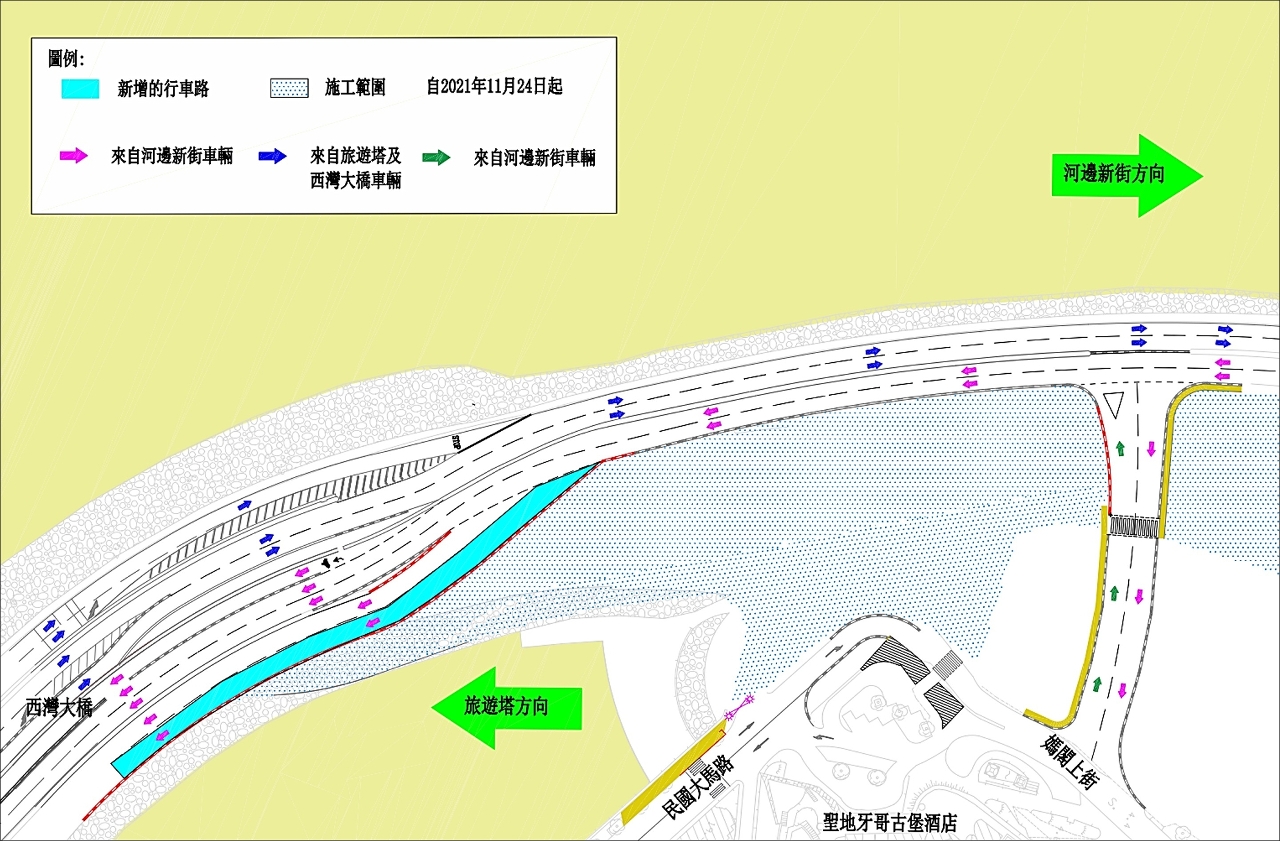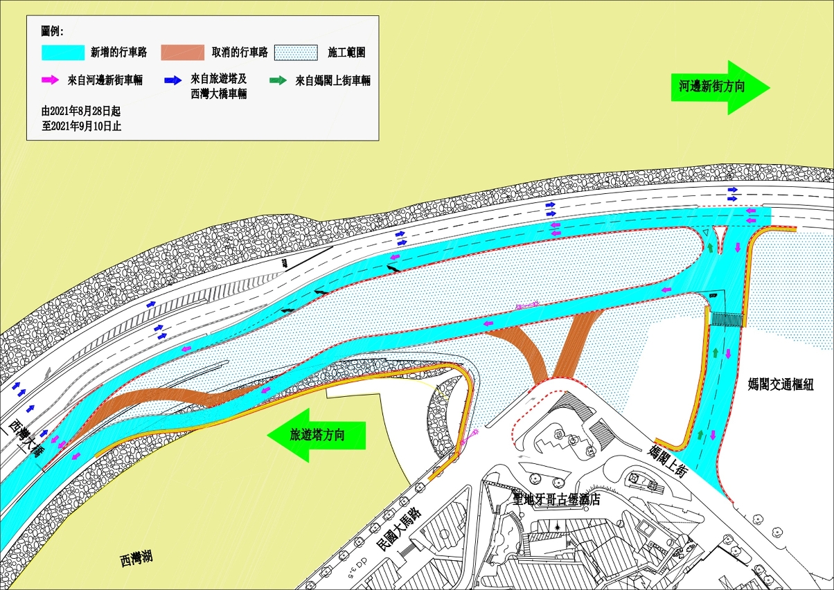 - 28 de Agosto até 10 de Setembro: Os veículos terão de utilizar a faixa de rodagem do Centro Modal de Transportes da Barra para o acesso de ida e volta à Avenida Panorâmica do Lago Sai Van, devido ao cancelamento do cruzamento das vias situado na Rua de São Tiago da Barra e na Avenida da República para o acesso de ida e volta à Avenida Panorâmica do Lago Sai Van (vide figura 1);