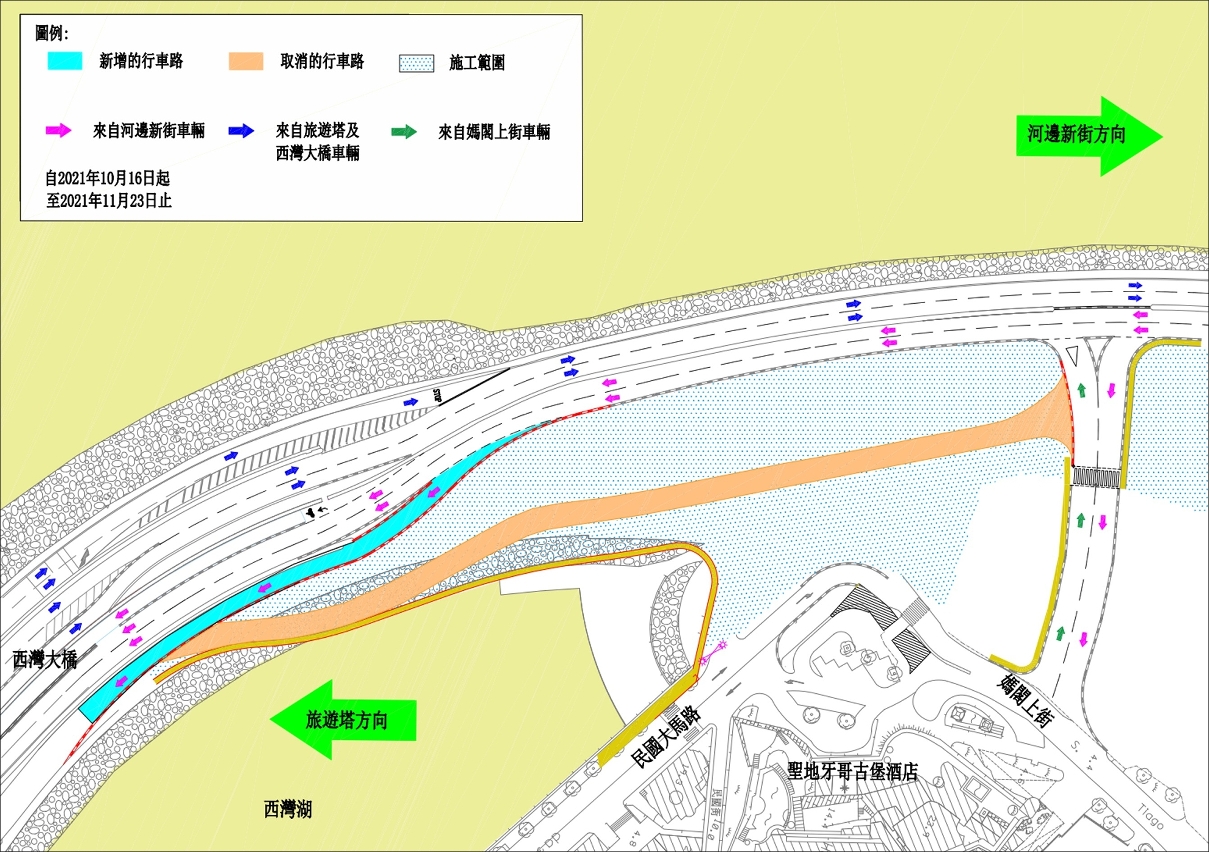 - 16 de Outubro até 23 de Novembro: Será cancelado um troço da faixa de rodagem provisória em direcção à Torre de Macau e os veículos terão de circular a linha sul da actual Avenida Panorâmica do Lago Sai Van em direcção à Torre de Macau (vide figura 3);