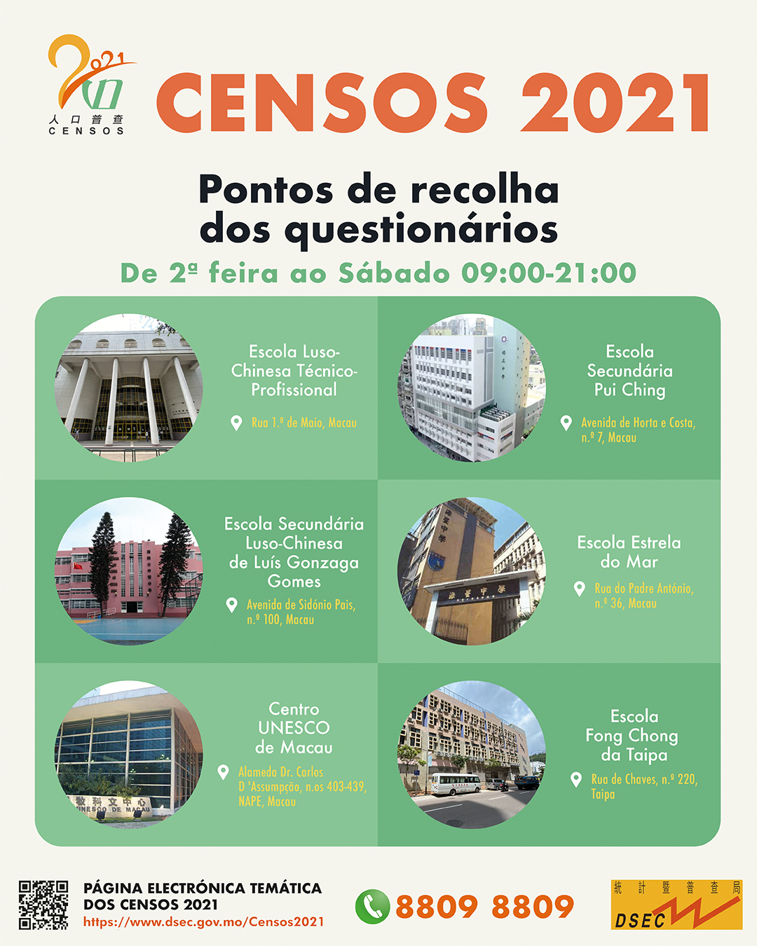 Os resultados dos Censos não só reflectem a evolução da estrutura demográfica de Macau e das respectivas características socioeconómicas, como também são referências relevantes para o Governo da RAEM no planeamento do futuro. A DSEC apela a todos os cidadãos de Macau que colaborem com a realização dos Censos e forneçam as informações correctas. Para mais pormenores sobre os Censos, queira aceder à página electrónica temática dos Censos 2021: https://www.dsec.gov.mo/Censos2021, ou ligar para a linha azul dos Censos 8809 8809.