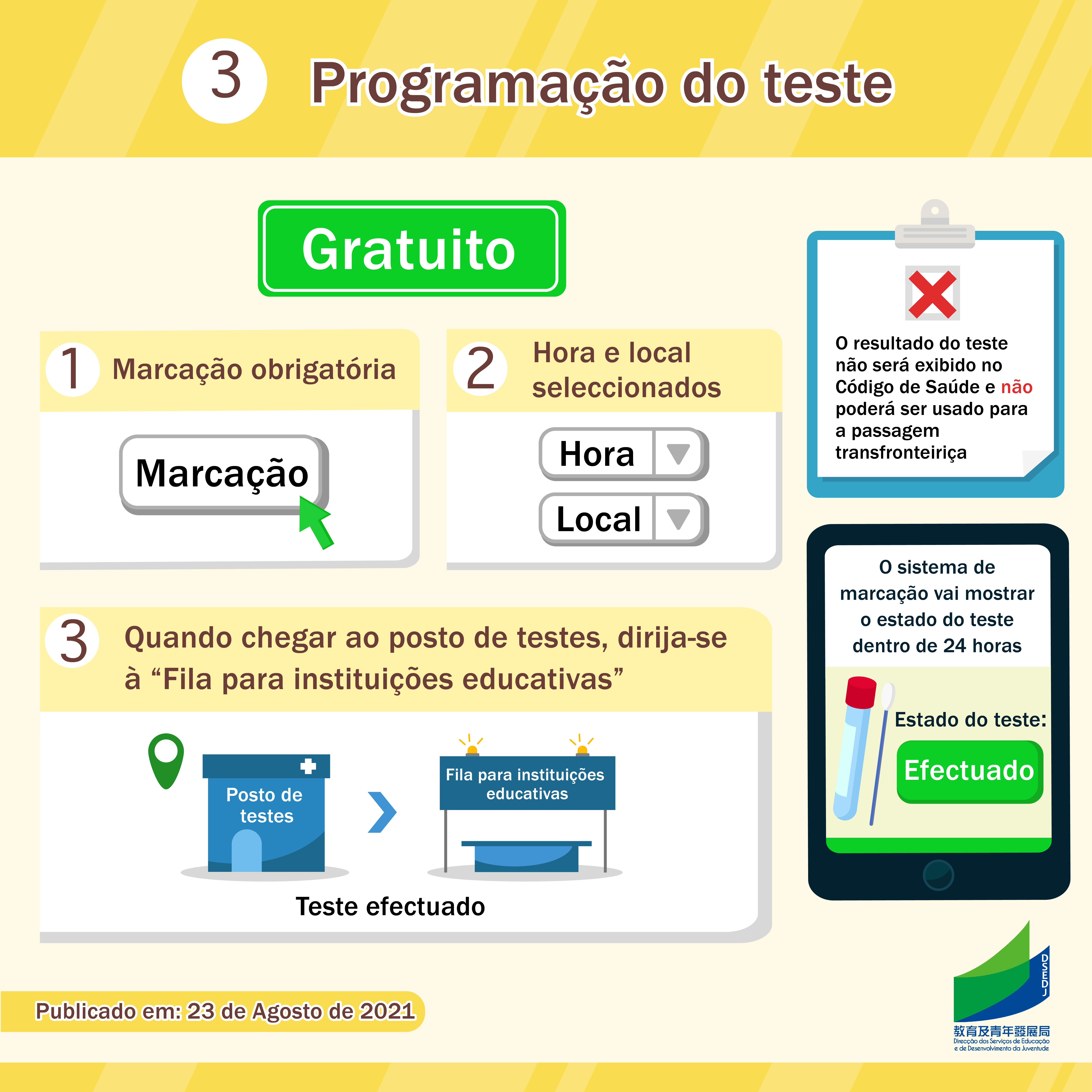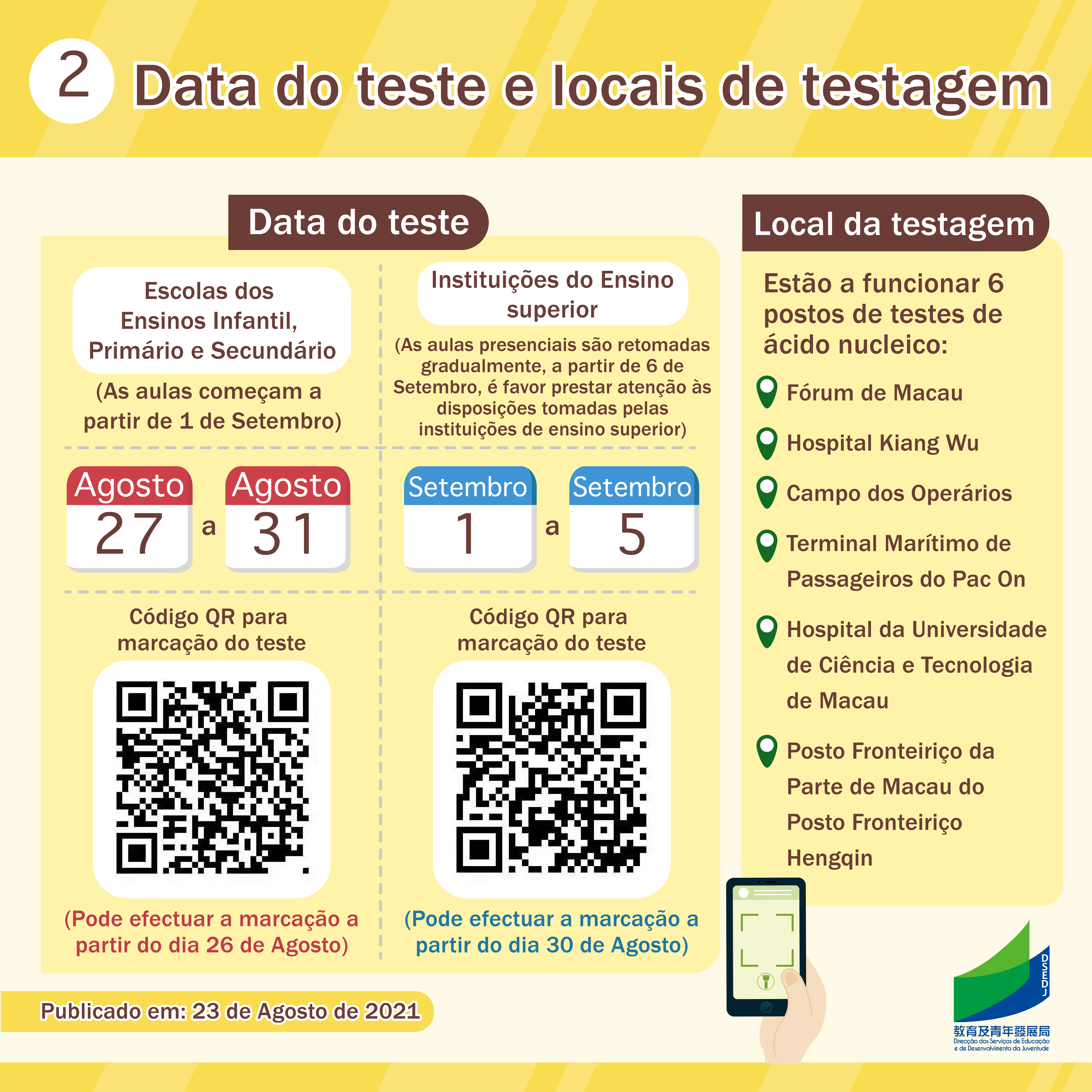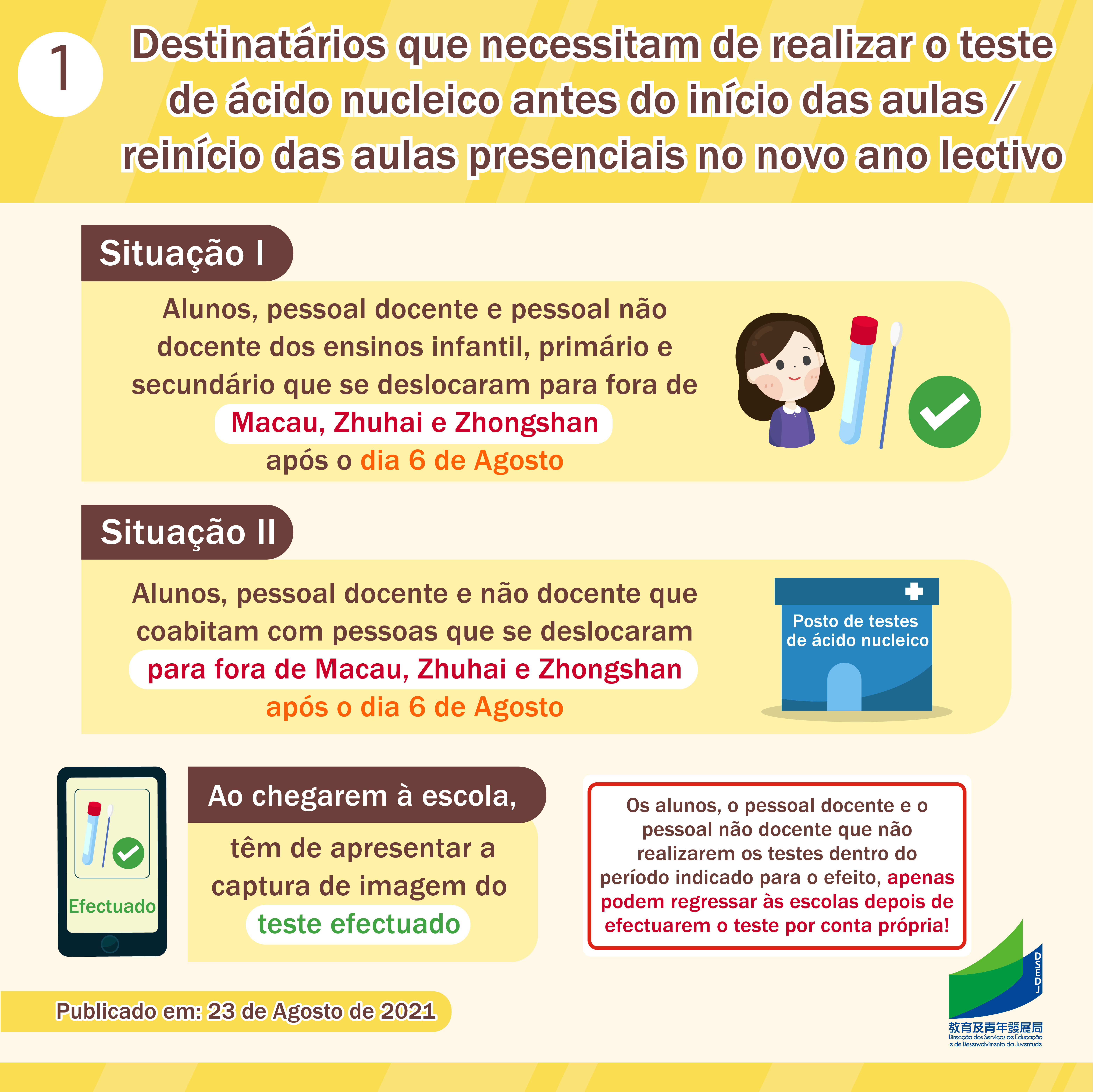 Para garantir um início seguro e atempado do novo ano lectivo, assegurando a saúde da população estudantil, a DSEDJ e os Serviços de Saúde aplicarão medidas de prevenção da epidemia no novo ano lectivo de acordo com os padrões mais elevados, actualizando ainda mais o plano de contingência para o ínicio das aulas. Parte dos alunos e do pessoal docente e não docente vai efectuar testes de ácido nucleico descartáveis, uma única vez, cinco dias antes do início das aulas ou da retomada das aulas presenciais. Os destinatários dos testes são os alunos, o pessoal docente e o pessoal não docente que, depois do dia 6 de Agosto, se deslocaram para regiões fora de Macau, Zhuhai e Zhongshan, assim como os alunos, pessoal docente e não docente que coabitam com pessoas que saíram da RAEM e se deslocaram para regiões fora dos locais acima referidos depois da mesma data. Os alunos, pessoal docente e não docente, acima referidos, no regresso às instituições educativas, necessitam de apresentar uma captura de imagem do teste efectuado.