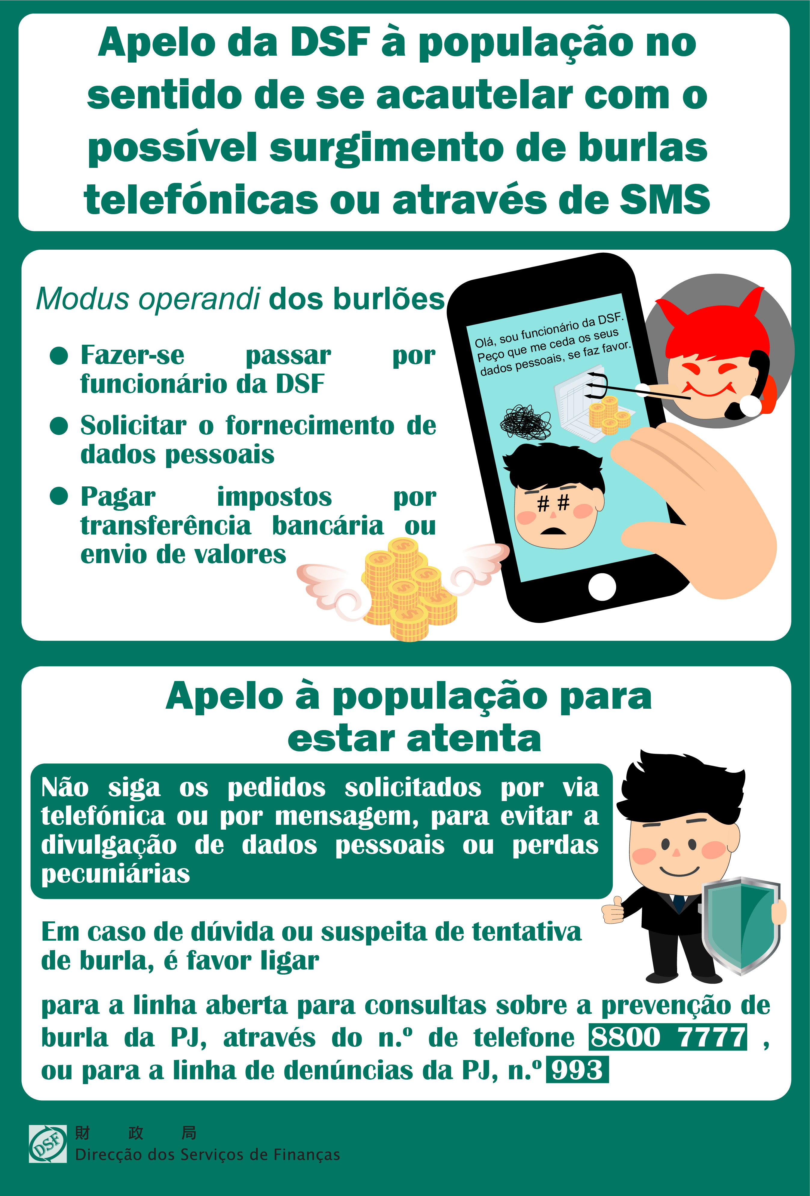 Recentemente, vários cidadãos comunicaram à Direcção dos Serviços de Finanças (DSF) que receberam chamadas telefónicas ou SMS de um alegado funcionário da DSF, a solicitar-lhes o fornecimento de dados pessoais ou o pagamento de impostos por transferência bancária ou envio de valores. A DSF apela à população para estar atenta e não seguir os pedidos solicitados por via telefónica ou por mensagem, no sentido de evitar a divulgação de dados pessoais ou perdas pecuniárias. Em caso de dúvida ou suspeita de tentativa de burla, por favor ligar para a linha aberta para consultas sobre a prevenção de burla ou a linha de denúncias da Polícia Judiciária, através dos n.os de telefone 88007777 ou 993, respectivamente.