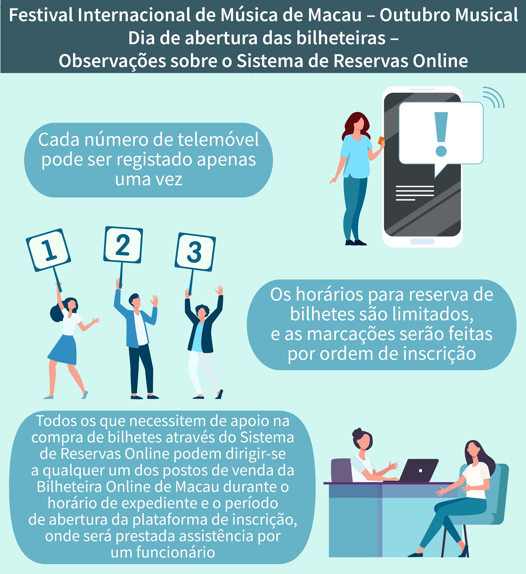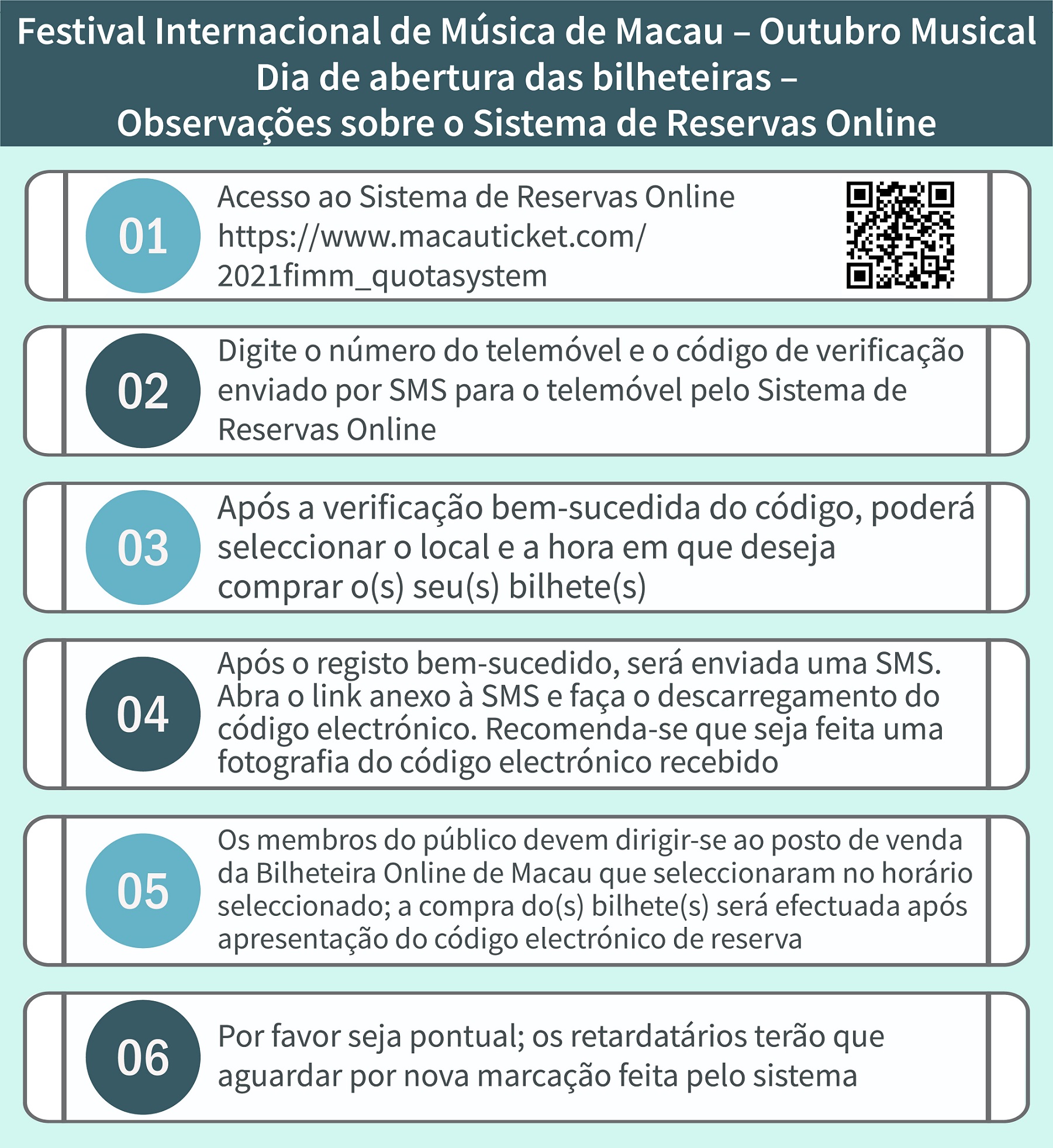 A fim de cumprir com as exigências impostas pelos trabalhos de prevenção pandémica, o Instituto Cultural procedeu ao aperfeiçoamento do sistema de aquisição de bilhetes para o Festival Internacional de Música de Macau, com o intuito de proporcionar condições que permitam à população adquirir o seu bilhete de forma pragmática e simples e estimular a população a ter um maior aproveitamento da comodidade trazida pelos serviços de Governação Electrónica. Mais concretamente, durante o primeiro dia de venda pública, os bilhetes estarão disponíveis simultaneamente nas bilheteiras físicas e virtuais, ao passo que, para quem pretender adquirir presencialmente o seu bilhete nesse dia, no horário das 10:00 às 12:00 horas, nos postos da Bilheteira Online de Macau, encontra-se disponível o Sistema de Reservas Online, no qual, a partir das 10:00 horas do dia 23 de Setembro (Quinta-Feira), quem efectuar com sucesso a sua inscrição prévia através do número de telemóvel pode seleccionar o local e o horário específicos para aquisição e levantamento de bilhetes, bastando posteriormente dirigir-se ao local no horário indicado. Os interessados que necessitem de assistência na utilização deste sistema de reservas online podem dirigir-se a um posto físico da Bilheteira Online de Macau à sua escolha, no seu horário de expediente e durante o prazo de abertura do sistema de reservas acima mencionado, para solicitar apoio nesse sentido. Devido ao limite de vagas para os horários de reserva de bilhetes, a sua atribuição é definida com base na ordem de inscrição efectuada, sendo permitida uma única inscrição para cada número de telemóvel. Para os interessados que pretendam reservar o seu bilhete por telefone ou pela plataforma online convencional, não é necessária qualquer inscrição prévia. No primeiro dia de venda, para todos os concertos, há um limite máximo de seis bilhetes por concerto por pessoa.