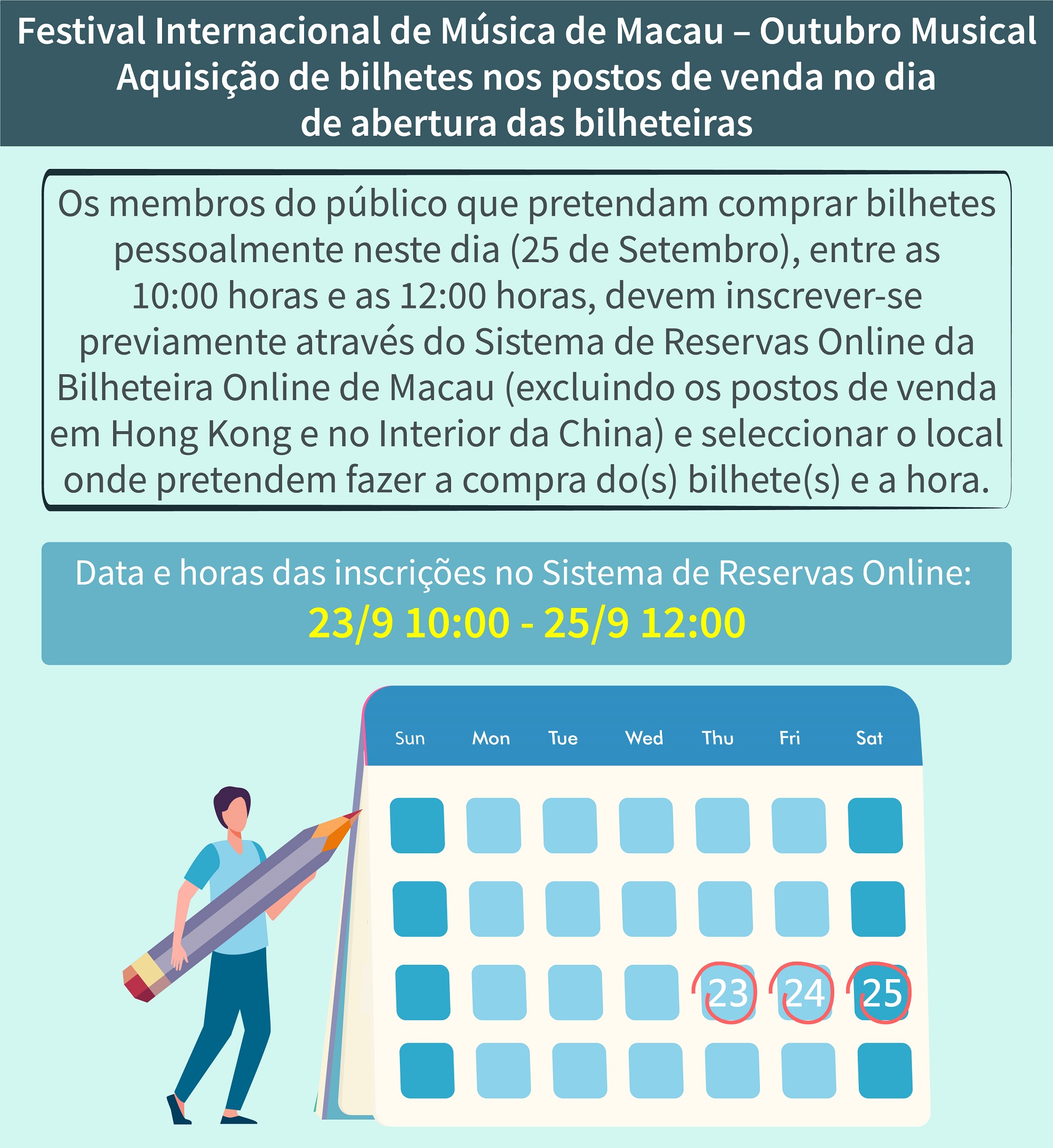 O Festival Internacional de Música de Macau – Outubro Musical, organizado pelo Instituto Cultural, irá decorrer, durante o mês de Outubro, e, no próximo dia 25 de Setembro (Sábado), os bilhetes estarão oficialmente à venda, a partir das 10:00 horas, na Bilheteria Online de Macau. Por forma a colaborar com os trabalhos de prevenção da pandemia e assegurar a saúde dos residentes, a partir das 10:00 do primeiro dia de venda, os bilhetes estarão disponíveis em simultâneo nos postos de venda da Bilheteira Online de Macau, por telefone e por reserva online. Além disso, com o intuito de reduzir o fluxo e as filas de espera de pessoas na aquisição presencial de bilhetes, será aberto ao público o Sistema de Reservas Online para fins de compra de bilhetes no primeiro dia. Os interessados que pretendam adquirir os seus bilhetes presencialmente, entre as 10:00 e as 12:00 horas do dia de abertura das bilheteiras, nos locais habituais da Bilheteira Online de Macau, devem efectuar a respectiva inscrição prévia e seleccionar o local e o horário específicos, para aquisição e levantamento, no Sistema de Reservas Online da Bilheteira Online de Macau, a partir das 10:00 do dia 23 de Setembro (Quinta-Feira).