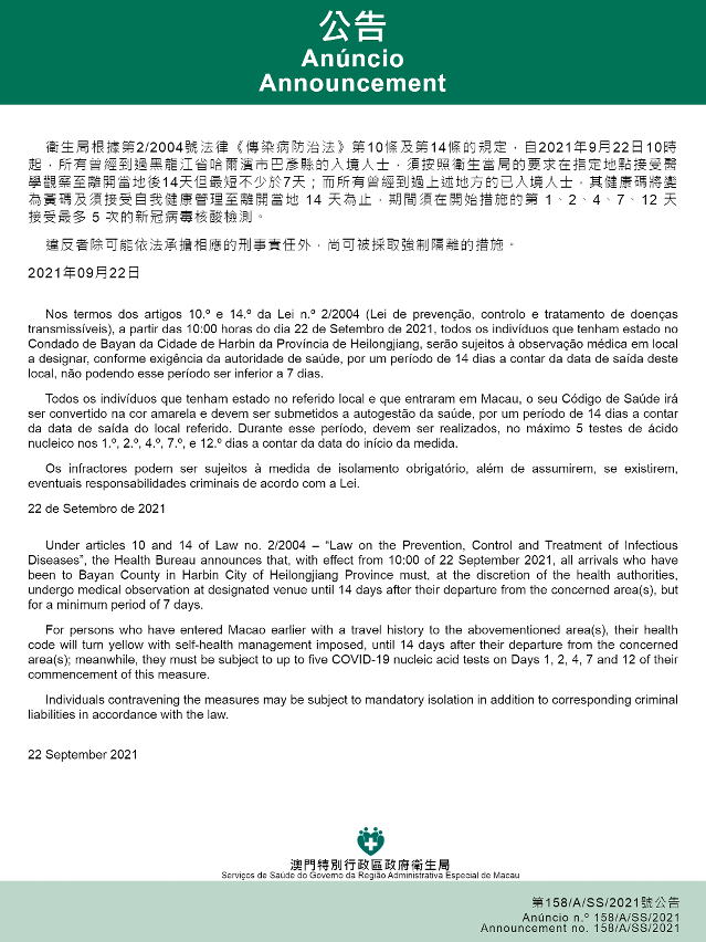 O Centro de Coordenação de Contingência do Novo Tipo de Coronavírus informa que tendo em consideração a evolução epidemiológica mais actualizada na Província de Heilongjiang, nos termos dos artigos 10.º e 14.º da Lei n.º 2/2004 (Lei de prevenção, controlo e tratamento de doenças transmissíveis), a partir das 10:00 horas do dia 22 de Setembro de 2021, todos os indivíduos que tenham estado no Condado de Bayan da Cidade de Harbin da Província de Heilongjiang, serão sujeitos a observação médica em local a designar, conforme exigência da autoridade de saúde, por um período de 14 dias a contar da data de saída deste local, não podendo esse período ser inferior a 7 dias.