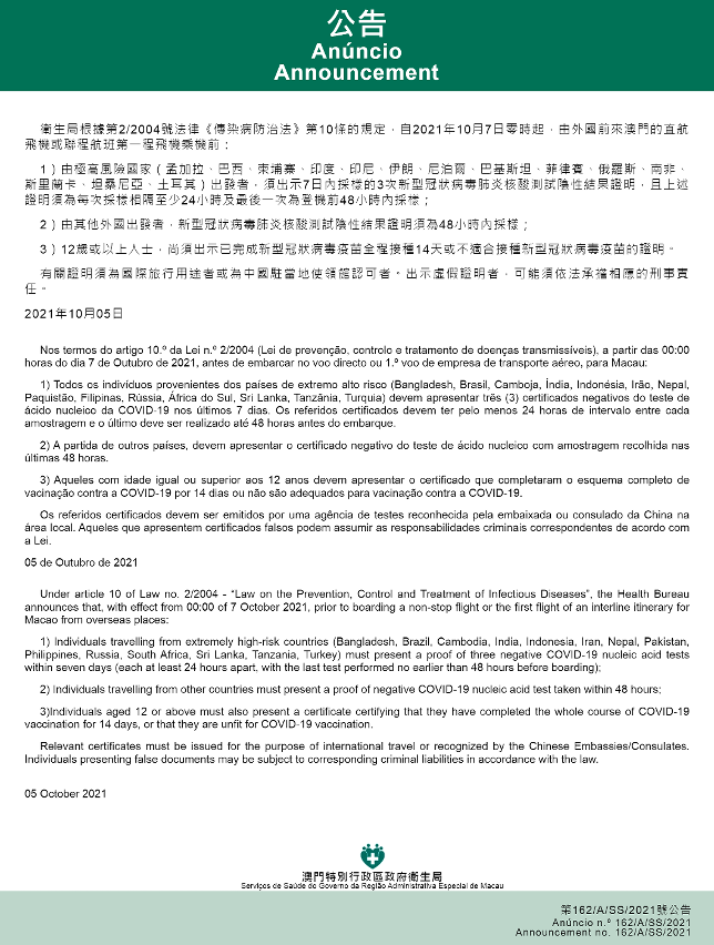 O Centro de Coordenação de Contingência do Novo Tipo de Coronavírus informa que, em resposta da situação epidémica mais actualizada, nos termos do artigo 10.º da Lei n.º 2/2004 (Lei de prevenção, controlo e tratamento de doenças transmissíveis), a partir das 00:00 horas do dia 7 de Outubro de 2021, antes de embarcar no voo directo ou 1.º voo de empresa de transporte aéreo, para Macau: