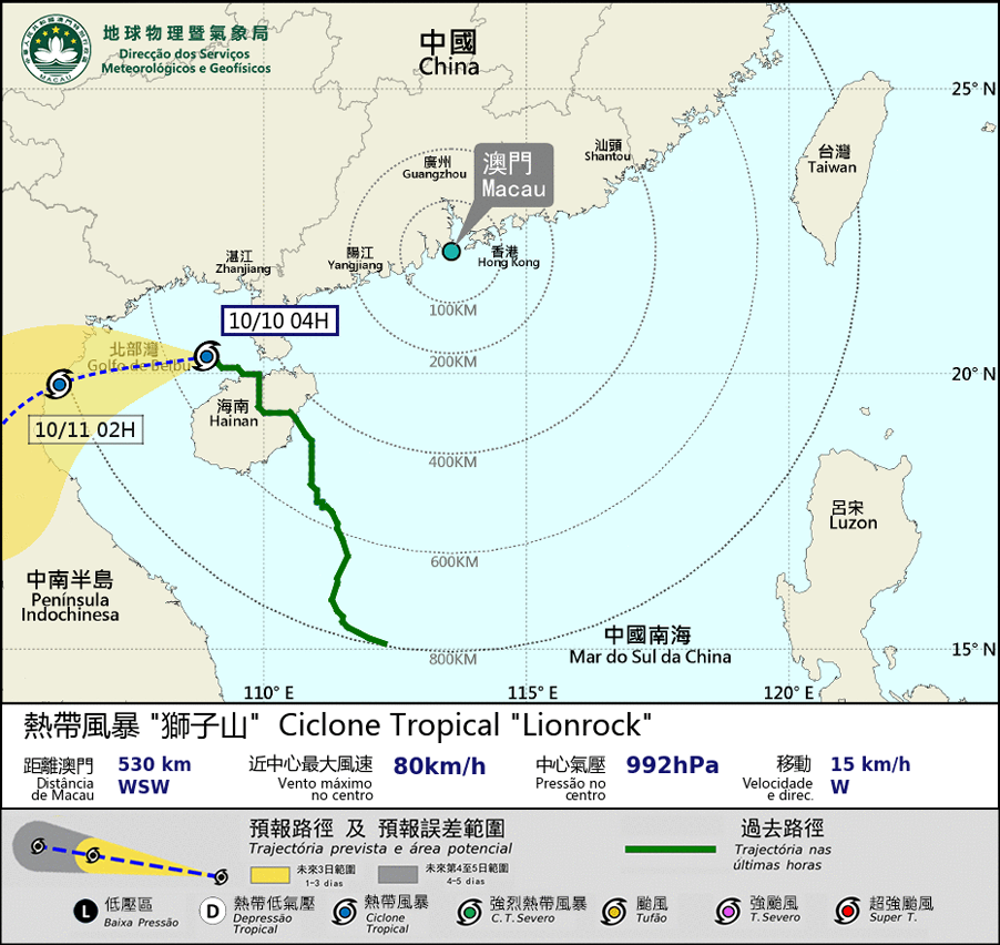 Com o afastamento do “Lionrock” de Macau, e devido ao enfraquecimento do efeito de confluência associada com a monção nordeste, o vento na região vai enfraquecer progressivamente. No início da manhã do dia 10, ao longo da costa de Guangdong, continuará a ser afectado pela circulação externa relacionada com o “Lionrock”. Na região, ainda ocorrem aguaceiros e trovoadas. O vento máximo pode atingir ocasionalmente o nível 5 – 6 da escala “Beaufort”, com rajadas. Recomenda-se à população que continue atento e tome medidas contra o vento.