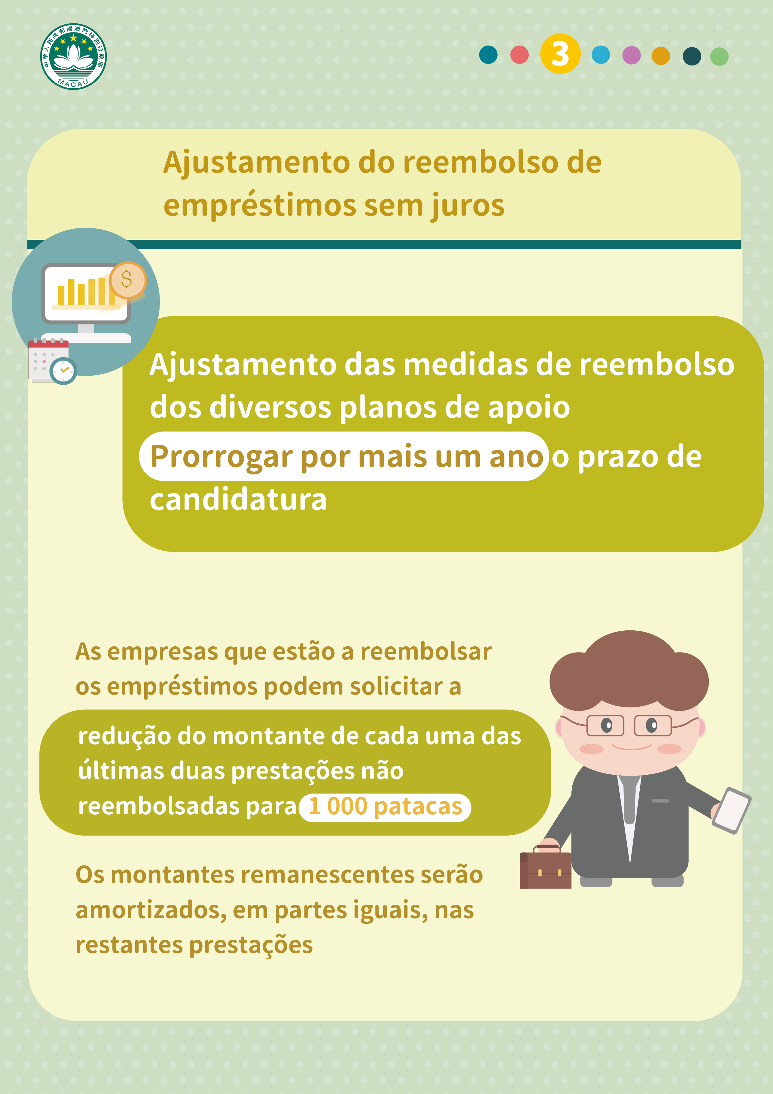 As empresas que estão a reembolsar os empréstimos podem solicitar a redução do montante de cada uma das últimas duas prestações não reembolsadas para 1 000 patacas, sendo os montantes remanescentes amortizados, em partes iguais, nas restantes prestações.