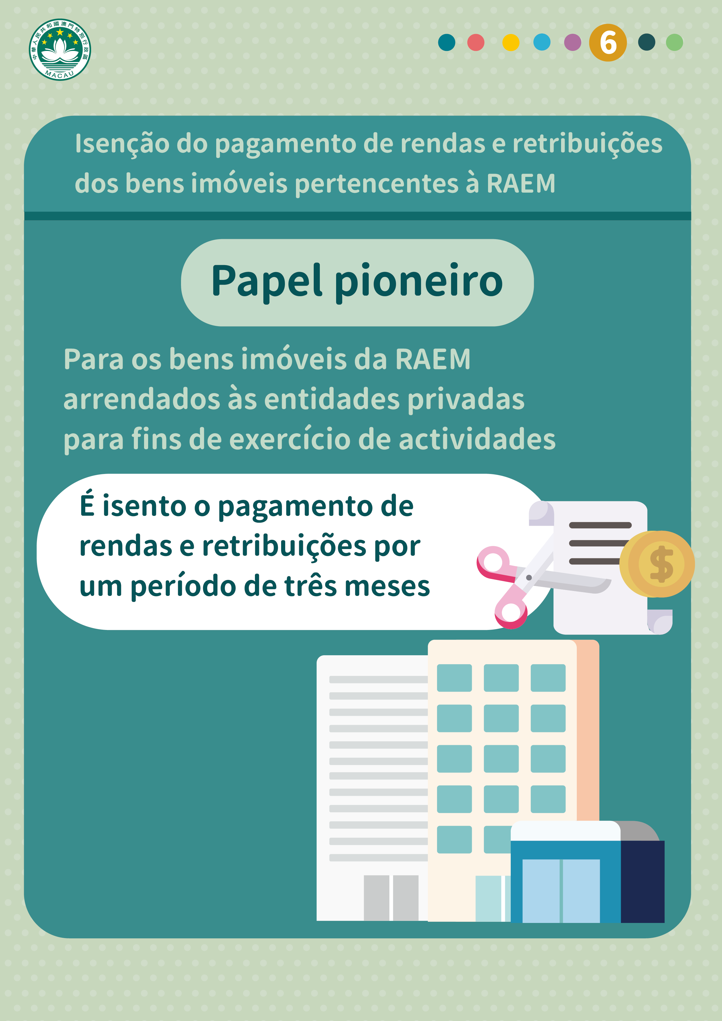 Para os bens imóveis da RAEM ou de outras pessoas colectivas de direito público, arrendados ou concedidos às entidades privadas para fins de exercício de actividades, é isento o pagamento de rendas e retribuições por um período de três meses.