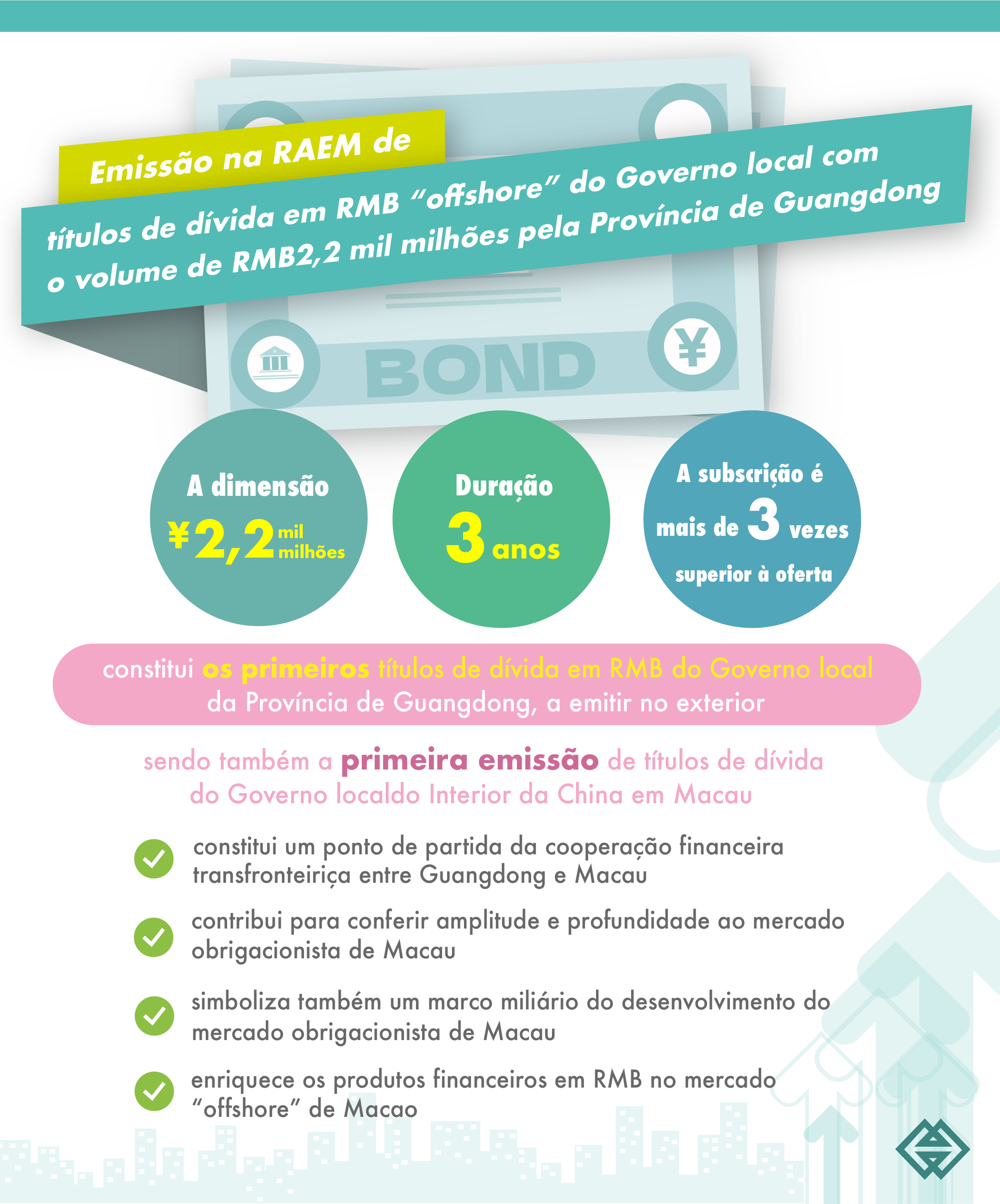Esta emissão de títulos de dívida da Província de Guangdong destina-se a investidores institucionais, tendo uma dimensão de RMB2,2 mil milhões, com uma duração de três anos e uma taxa de juros de emissão fixada de 2,68%, sendo proporcionadas, através desta emissão, mais opções de investimentos junto dos investidores institucionais locais e exteriores, no âmbito da participação no desenvolvimento económico da Província de Guangdong. Este projecto de emissão foi realizado, com sucesso, tendo contado com a participação de investidores institucionais locais e exteriores, nomeadamente, o Interior da China, Hong Kong, a região de Taiwan, o Brasil, a Austrália e o Japão, sendo a subscrição 3 vezes superior à oferta, o que demonstra que esta emissão respondeu à procura manifestada pelos investidores.