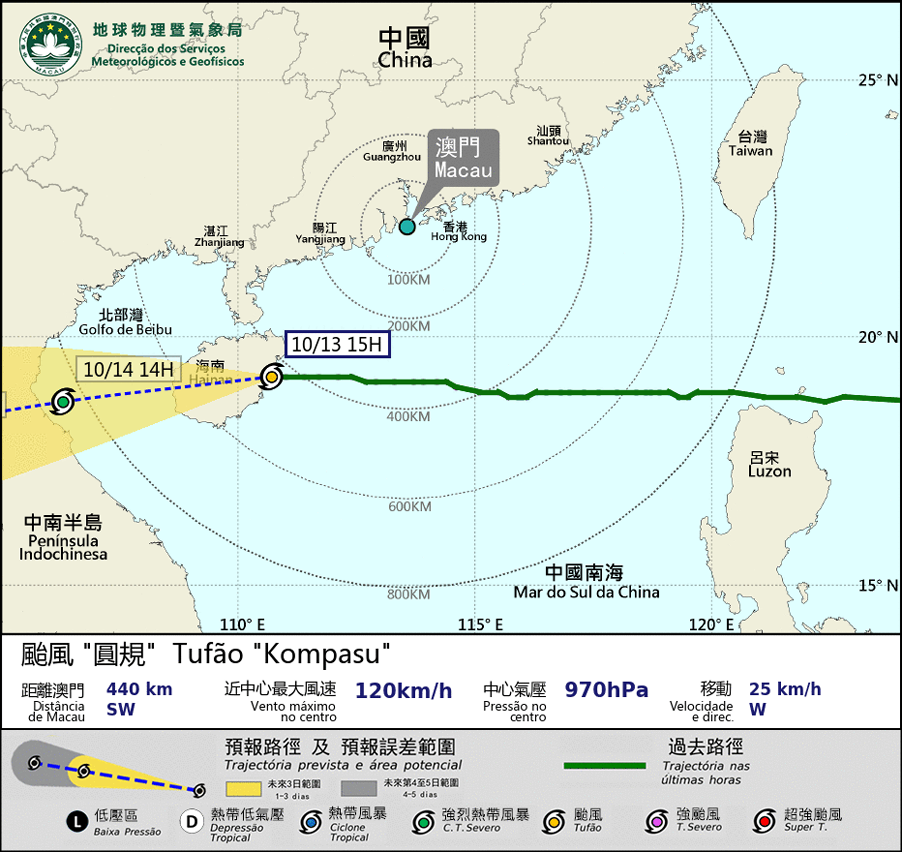 O tufão “Kompasu” continua a mover-se mais para oeste e vai atingir terra da Ilha de Hainan, durante a tarde. Com o afastamento do “Kompasu” da região, a possibilidade de Macau ser afetado por ventos fortes vai reduzir. Entre as 17:00 e as 20:00 horas, esta Direcção vai considerar emitir o sinal n.o 3. No entanto, o tempo na região continua a ser afectado pela circulação externa associada. Deste modo, nas próximas horas, na região ainda vão continuar os aguaceiros e as trovoadas.