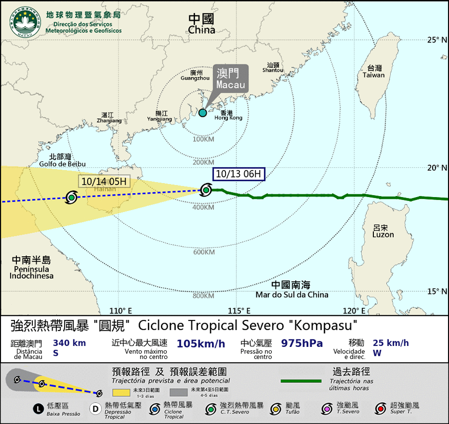 O “Kompasu” está a passar cerca de 340 quilómetros a sul de Macau. O impacto do sistema em Macau será o mais significativo nas próximas horas. Os aguaceiros vão tornar-se mais frequentes. O vento vai intensificar-se, significativamente. O vento máximo pode atingir o nível 8 a 9 da escala “Beaufort”, soprando ao nordeste, posteriormente, alterado para quadrante leste. Sugere-se à população que preste atenção à variação de direcção do vento. Espera-se que o “Kompasu” continue a mover-se para o quadrante oeste, atravessando a parte setentrional do Mar do Sul da China. Por volta da noite, o ciclone tropical vai atingir na terra de Ilha de Hainan.