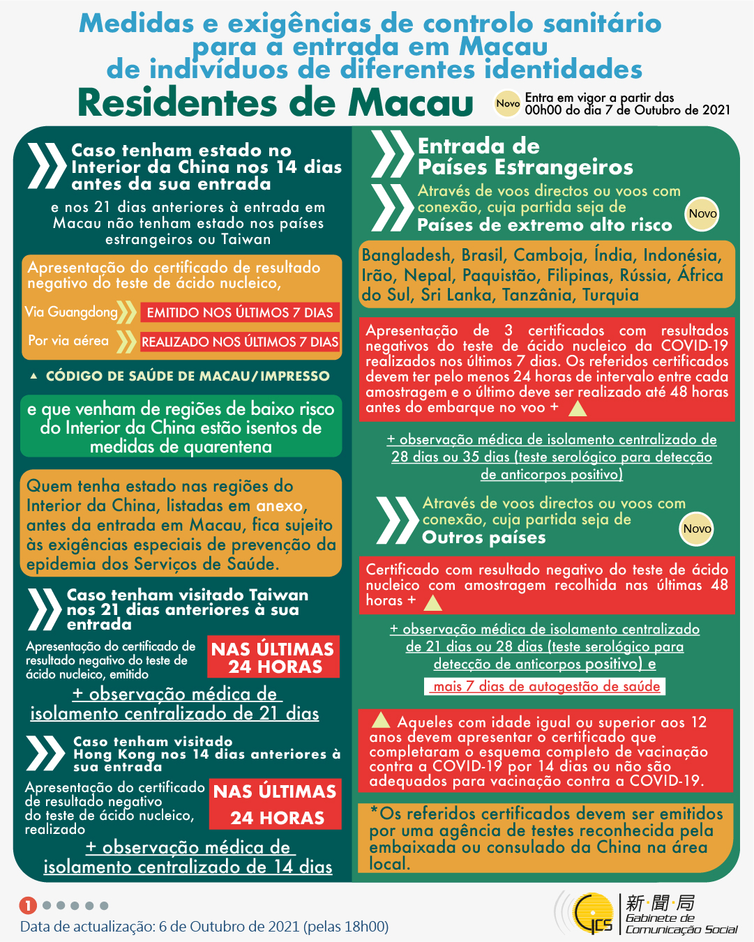 (Infografia)Medidas e exigências de controlo sanitário para a entrada em Macau de indivíduos de diferentes identidades, actualizadas no dia 18 de Outubro de 2021