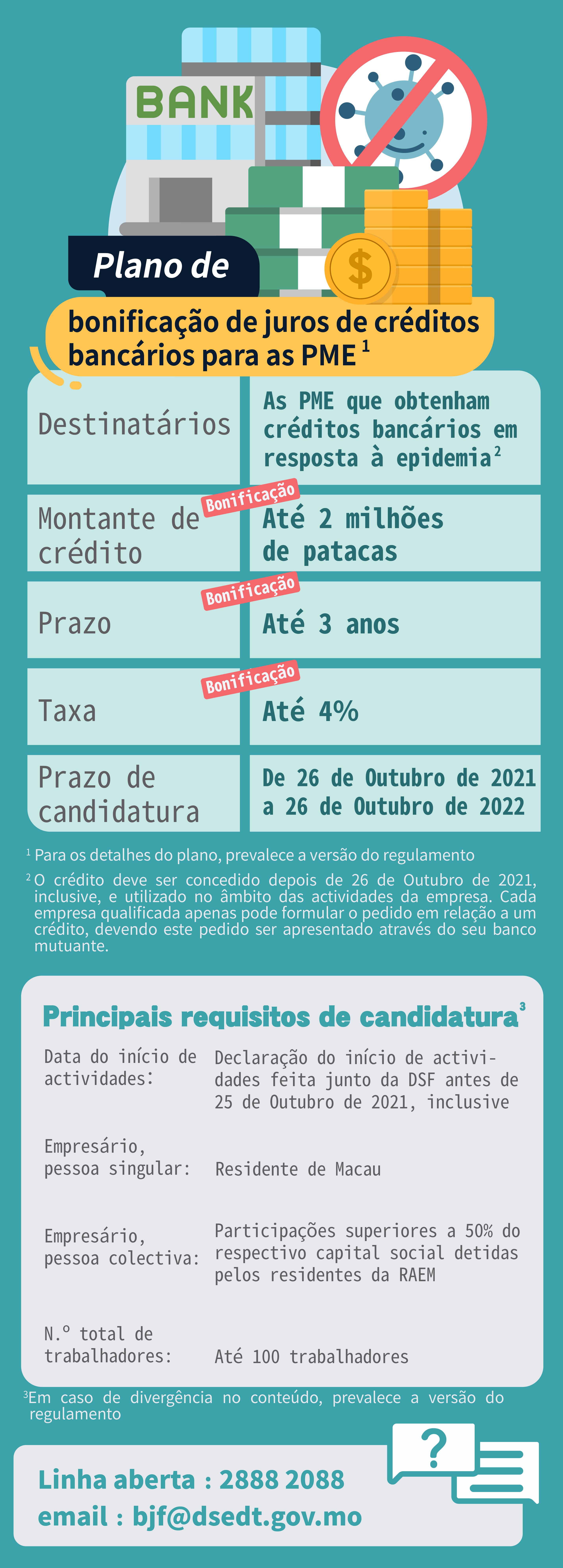 Além disso, as PME de Macau qualificadas, que obtiveram um crédito concedido por banco de Macau para dar resposta ao impacto provocado pela pneumonia causada pelo novo tipo de coronavírus no prazo de 12 meses contados a partir de hoje (dia 26), poderão, nos termos do “Plano de Bonificação de Juros de Créditos Bancários para as Pequenas e Médias Empresas”, apresentar o pedido de bonificação de juros, cujo montante máximo do crédito bonificado é de 2 milhões de patacas, com taxa anual de bonificação até 4% e com prazo máximo de bonificação de 3 anos. O prazo para a apresentação da candidatura terminará em 26 de Outubro de 2022.