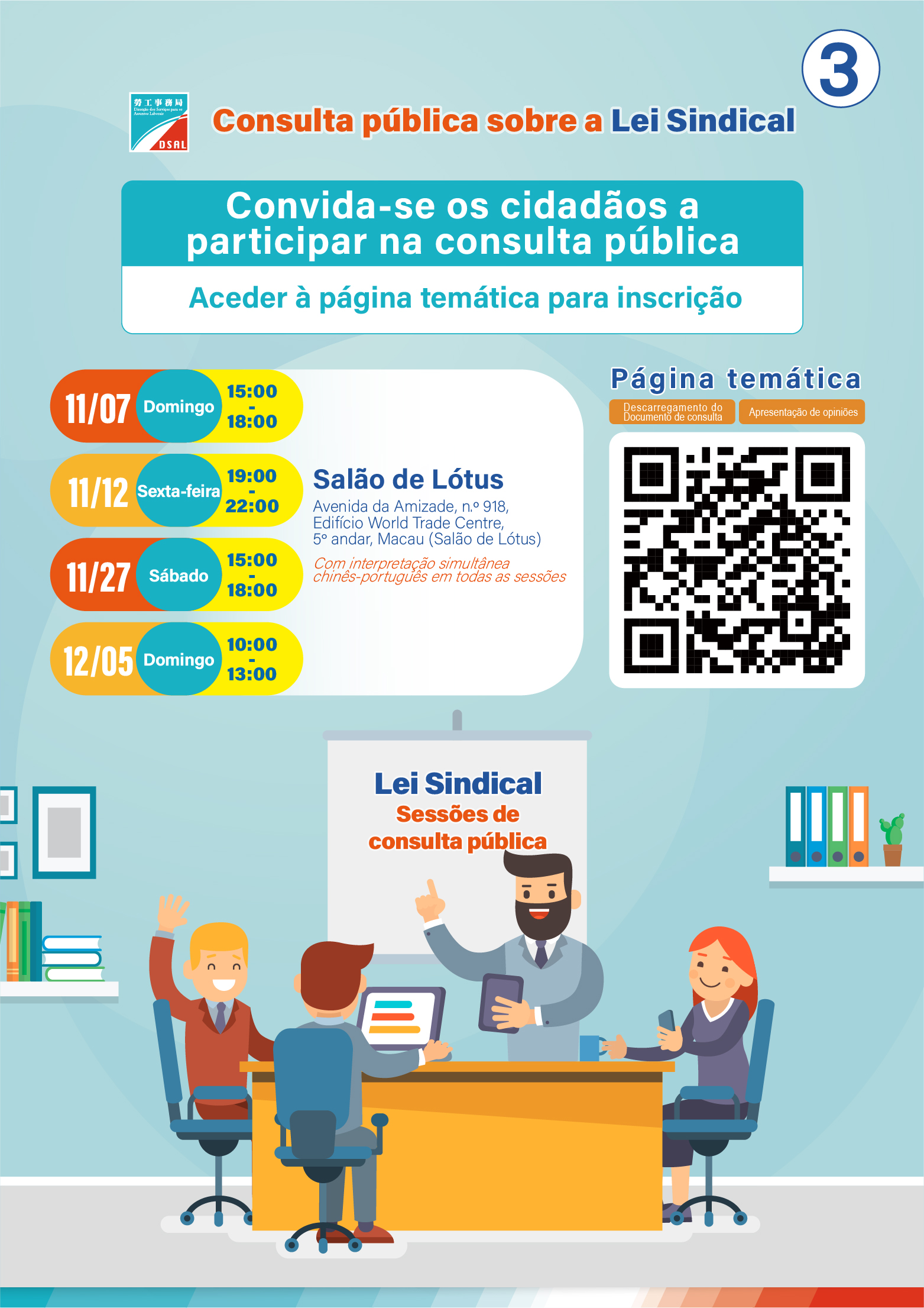 A fim de ouvir as opiniões e sugestões dos diversos sectores da sociedade sobre o Documento de consulta da “Lei Sindical”, a DSAL realizará, no período da consulta pública, quatro sessões de consulta que terão lugar na Avenida da Amizade, n.º 918, Edifício World Trade Centre, 5.º andar, Macau (Salão de Lótus). As sessões serão principalmente em língua chinesa, com interpretação chinês-português e serão realizadas nos dias: