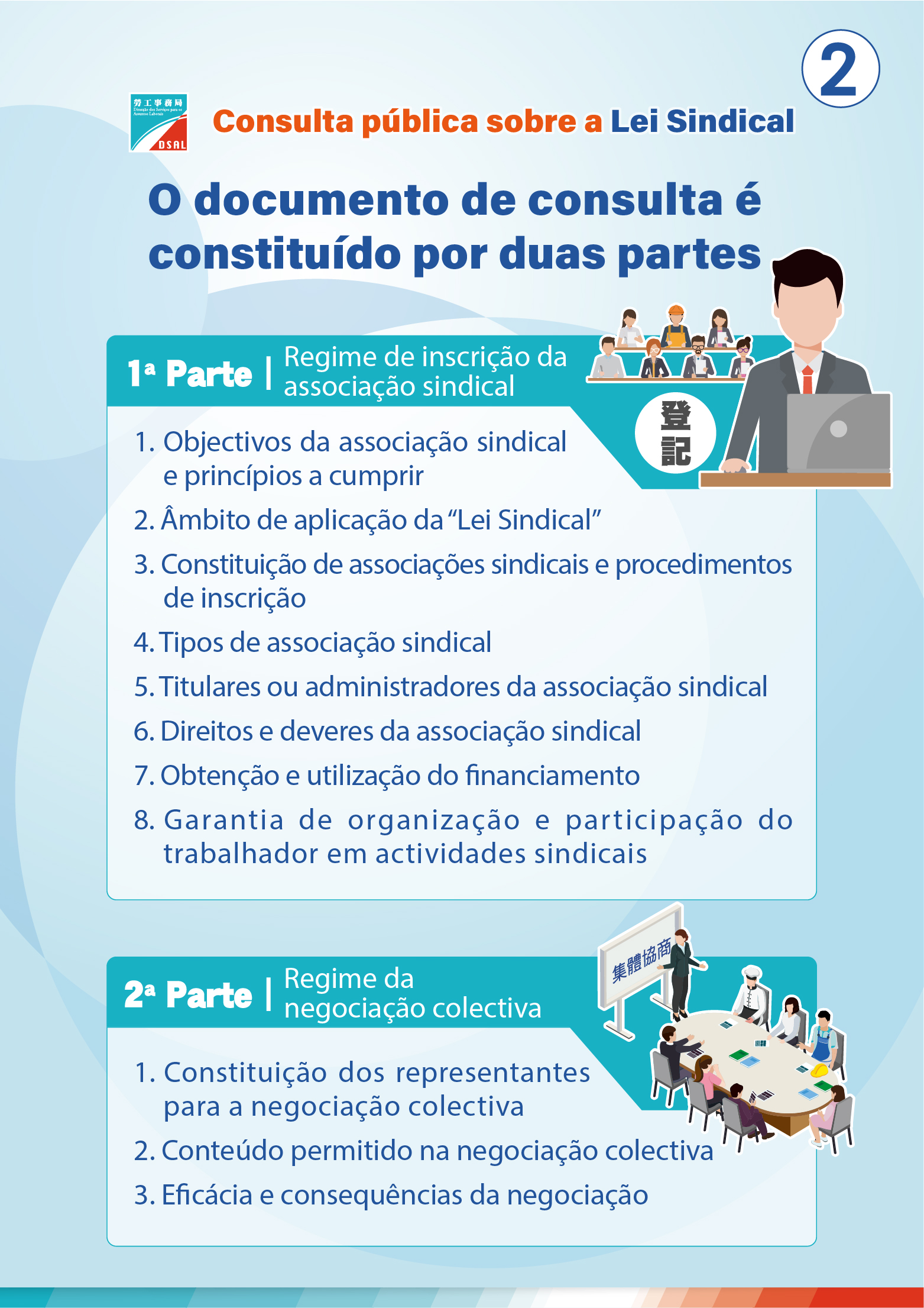 O Documento relevante da consulta é composto por duas partes. A primeira parte consiste no “Regime de inscrição da associação sindical”, com os seguintes conteúdos: 1) Objectivos da associação sindical e princípios a cumprir; 2) Âmbito de aplicação da “Lei Sindical”; 3) Constituição de associações sindicais e procedimentos de inscrição; 4) Tipos de associação sindical; 5) Titulares ou administradores da associação sindical; 6) Direitos e deveres da associação sindical; 7) Obtenção e utilização do financiamento; 8) Garantia de organização e participação do trabalhador em actividades sindicais. A segunda parte consiste no “Regime da negociação colectiva”, com os seguintes conteúdos: 1) Constituição dos representantes para a negociação colectiva; 2) Conteúdo permitido na negociação colectiva; 3) Eficácia e consequências da negociação.