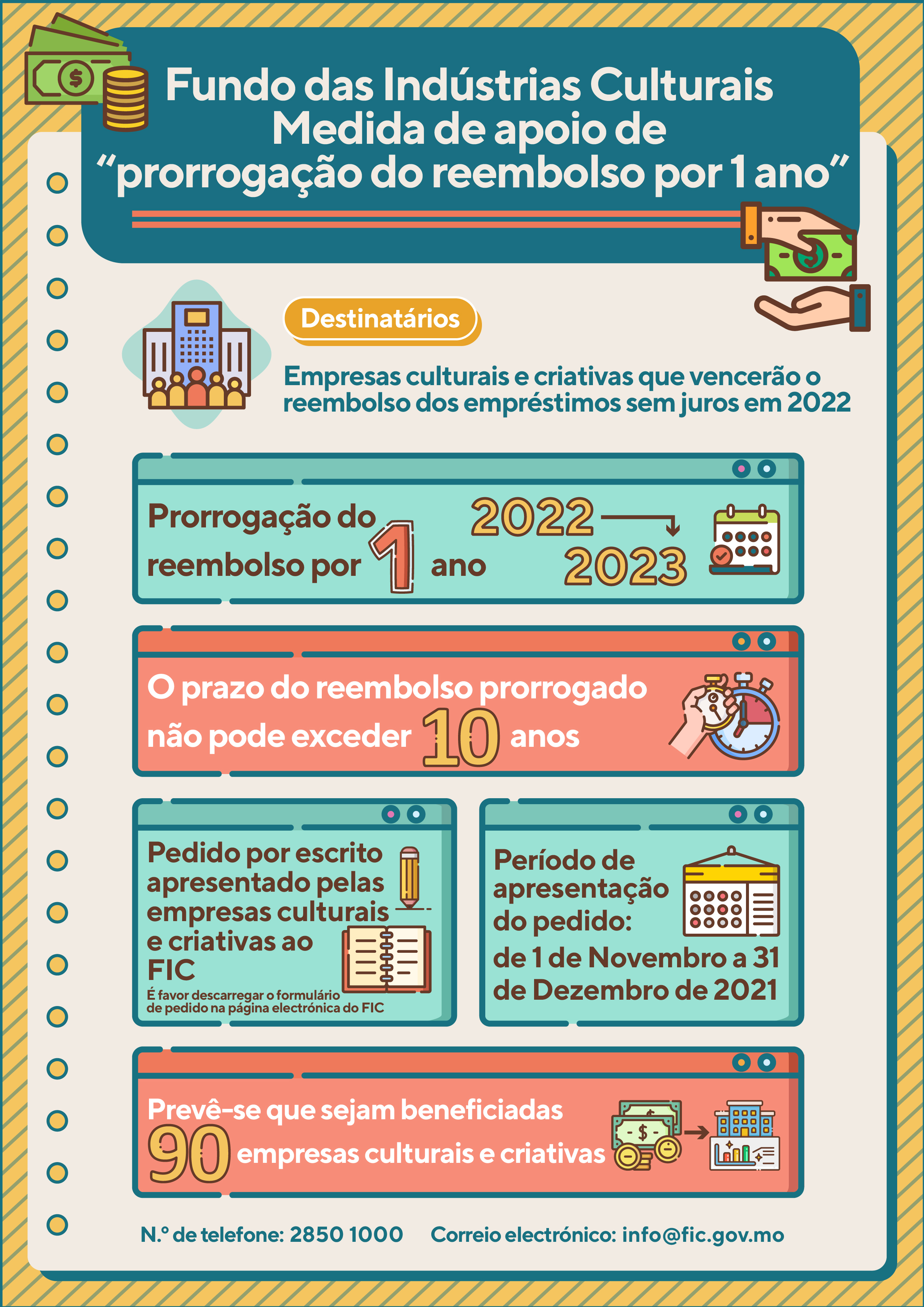 O período de apresentação do pedido para a medida de “prorrogação do reembolso por 1 ano” é de 1 de Novembro a 31 de Dezembro de 2021. As empresas culturais e criativas que irão vencer o reembolso dos empréstimos sem juros em 2022, podem requerer ao FIC, por escrito, a prorrogação do reembolso até 2023, de acordo com as necessidades reais, mas o prazo do reembolso prorrogado não pode exceder 10 anos.