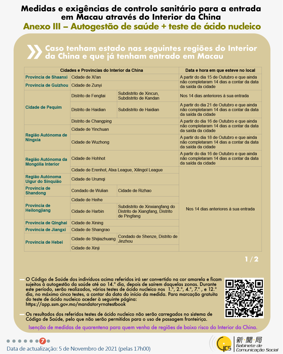 (Infografia)Medidas e exigências de controlo sanitário para a entrada em Macau de indivíduos de diferentes identidades, actualizadas no dia 5 de Novembro de 2021