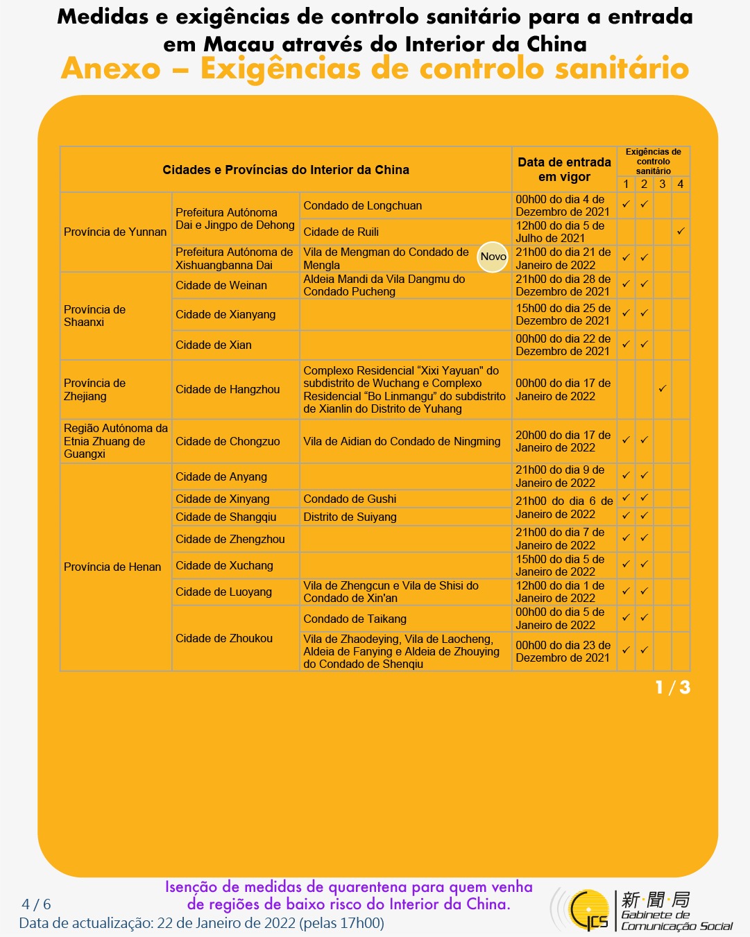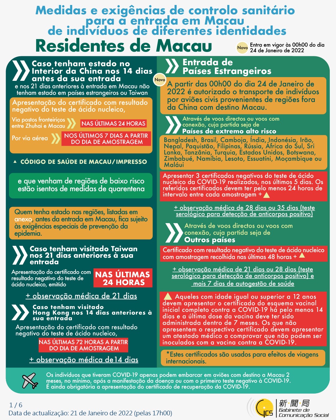 (Infografia)Medidas e exigências de controlo sanitário para a entrada em Macau de indivíduos de diferentes identidades, actualizadas no dia 22 de Janeiro de 2022