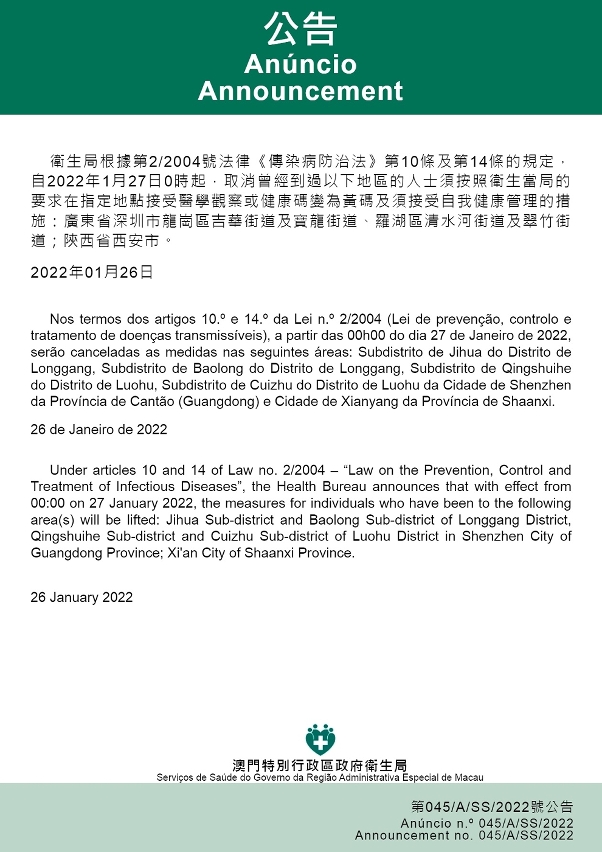 | Toda a zona da Aldeia de Guangsheng, Complexo Residencial “Rongyuan” de Jiangjunshan, Bloco 129 da 4.ª fase do Complexo Residencial “Huafa New Town” e Complexo Residencial “Jardim Chengfeng” da Aldeia de Shi’er da Vila de Nanping do Distrito de Xiangzhou (incluindo aqueles que já entraram em Macau) |
