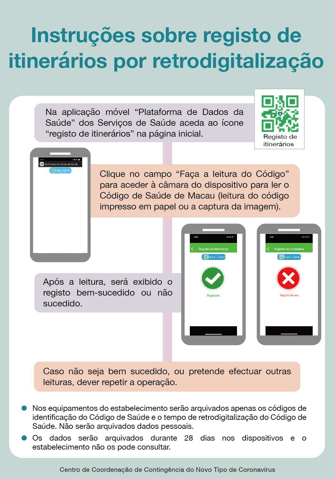 Os dados do Código de Saúde validados através da “retrodigitalização” (códigos de identificação do Código de Saúde e o tempo de retrodigitalização do Código de Saúde), serão arquivados por 28 dias nos telemóveis do estabelecimento ou outro dispositivo e apenas nestes. Estes dados não podem ser consultados pelo estabelecimento.
