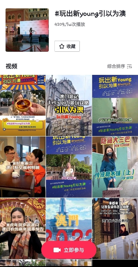 O desafio de “Vídeos curtos sobre Macau” com hashtag nas redes sociais Douyin e Xiaohongshu, lançado pela Direcção dos Serviços de Turismo (DST) em Dezembro passado, e que terminou no dia 6 de Fevereiro deste ano, atraiu um grande número de residentes e visitantes de Macau para participar e assistir aos vídeos sobre turismo da cidade. A iniciativa reuniu 757 vídeos curtos, dos quais 593 satisfizeram os requisitos de participação e acumulam actualmente mais de 42 milhões de visionamentos.
