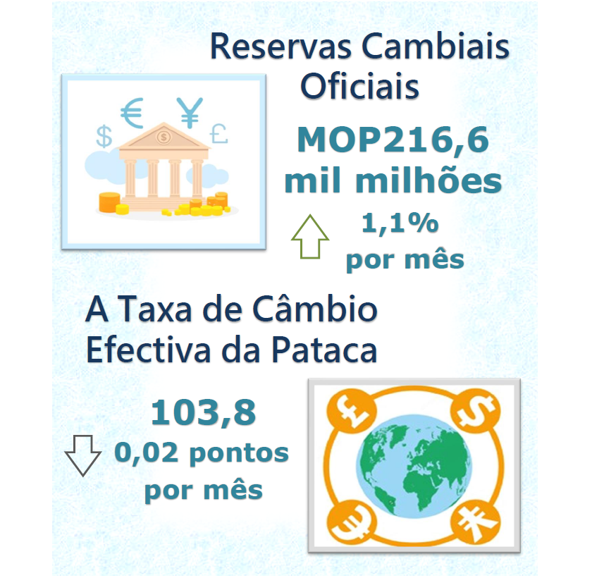 A taxa de câmbio efectiva da pataca, ponderada pelas suas quotas do comércio, foi de 103,8 em Janeiro de 2022, registaram decrescimento de 0,02 pontos e crescimento de 1,88 pontos, respectivamente, sobre os dados do mês anterior e relativos a Janeiro de 2021, implicando que globalmente, a pataca caiu mensalmente face às moedas dos principais parceiros comerciais de Macau, mas subiu anualmente.