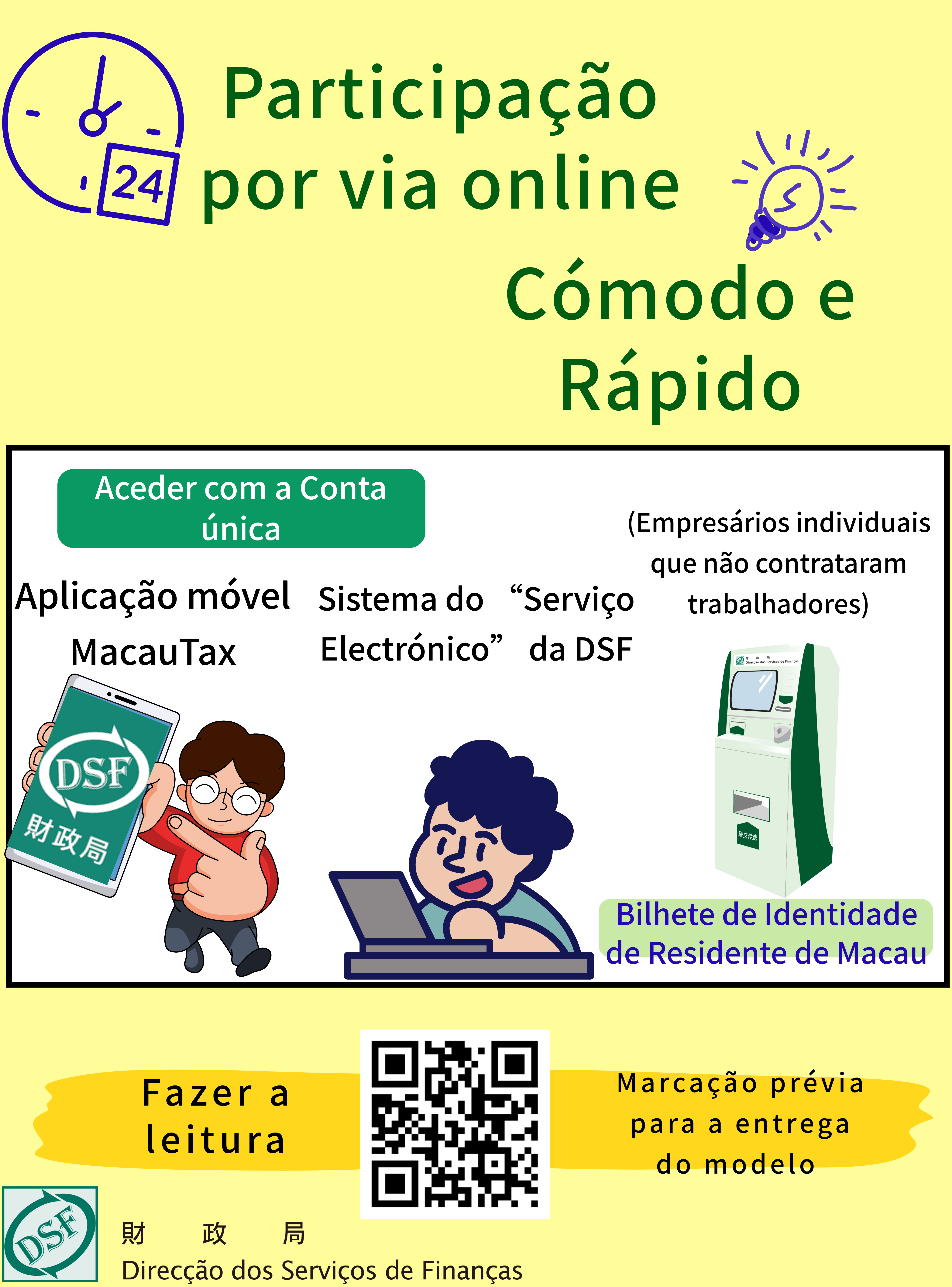 Como o primeiro trimestre do ano é o período de pico para a apresentação dos modelos fiscais, para evitar o tempo de espera e a aglomeração de pessoas, pode ser feita previamente a marcação para a entrega dos mesmos, através da “Plataforma comum de marcação prévia e espera” na aplicação móvel “Conta única” ou na página electrónica ( http://booking.gov.mo ).