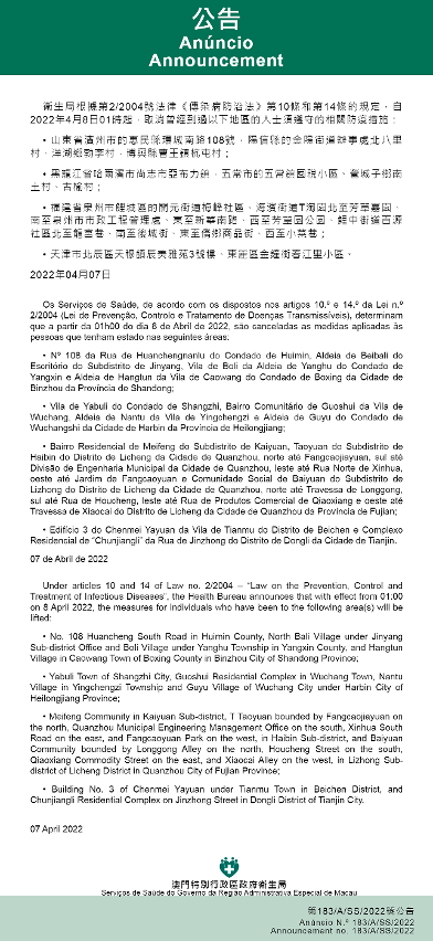 Tendo em consideração a evolução epidemiológica mais actualizada no Interior das China, os Serviços de Saúde, de acordo com os dispostos nos artigos 10.º e 14.º da Lei n.º 2/2004 (Lei de Prevenção, Controlo e Tratamento de Doenças Transmissíveis), determinam que a partir da 01h00 do dia 8 de Abril de 2022, todos os indivíduos que entrem ou já tenham entrado em Macau e tenham estado nos locais abaixo indicados, devem ser sujeitos à observação médica em local a designar, conforme exigências da autoridade de saúde, por um período de 14 dias a contar da data de saída destes locais, não podendo esse período ser inferior a 7 dias: