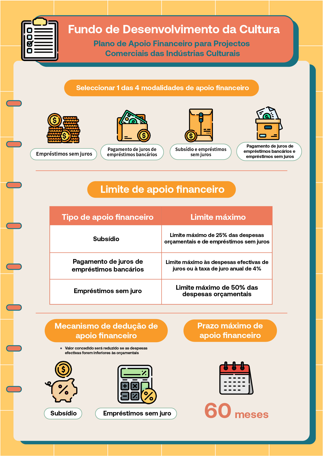 O prazo máximo de apoio financeiro é de 60 meses. Relativamente ao limite concedido, serão definidos diferentes valores máximos para a concessão por subsídio, pagamento de juros de empréstimos bancário e empréstimos sem juros. O valor concedido por subsídio e empréstimos sem juros será liquidado de acordo com as despesas efectivas no momento da conclusão do projecto. No caso de as despesas efectivas forem inferiores às despesas orçamentais do Boletim de Pedido, o valor concedido será deduzido de acordo com o mecanismo existente.