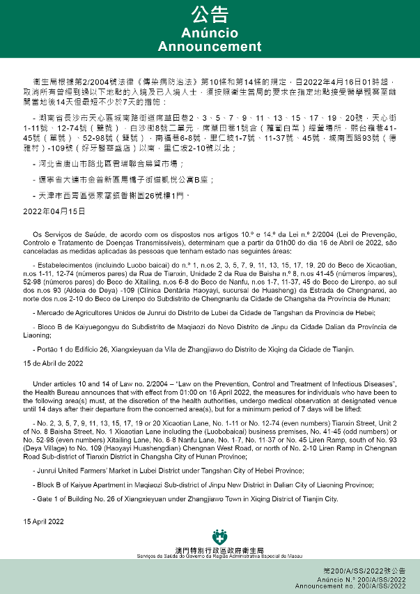 Tendo em consideração a evolução epidemiológica mais actualizada no Interior da China, os Serviços de Saúde, de acordo com os dispostos nos artigos 10.º e 14.º da Lei n.º 2/2004 (Lei de Prevenção, Controlo e Tratamento de Doenças Transmissíveis), determinam que a partir da 01h00 do dia 16 de Abril de 2022, todos os indivíduos que entrem ou já tenham entrado em Macau e tenham estado nos locais abaixo indicados, devem ser sujeitos à observação médica em local a designar, conforme exigências da autoridade de saúde, por um período de 14 dias a contar da data de saída destes locais, não podendo esse período ser inferior a 7 dias: