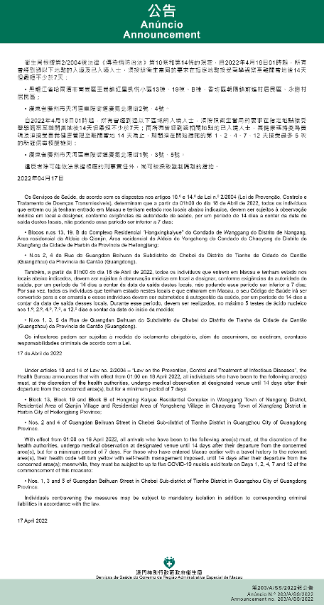 Tendo em consideração a evolução epidemiológica mais actualizada no Interior da China, os Serviços de Saúde, de acordo com os dispostos nos artigos 10.º e 14.º da Lei n.º 2/2004 (Lei de Prevenção, Controlo e Tratamento de Doenças Transmissíveis), determinam que a partir da 01h00 do dia 18 de Abril de 2022, todos os indivíduos que entrem ou já tenham entrado em Macau e tenham estado nos locais abaixo indicados, devem ser sujeitos à observação médica em local a designar, conforme exigências da autoridade de saúde, por um período de 14 dias a contar da data de saída destes locais, não podendo esse período ser inferior a 7 dias: