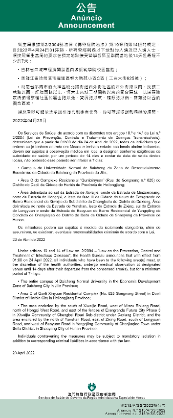 Tendo em consideração a evolução epidemiológica mais actualizada no Interior da China, os Serviços de Saúde, de acordo com os dispostos nos artigos 10.º e 14.º da Lei n.º 2/2004 (Lei de Prevenção, Controlo e Tratamento de Doenças Transmissíveis), determinam que a partir da 01h00 do dia 24 de Abril de 2022, todos os indivíduos que entrem ou já tenham entrado em Macau e tenham estado nos locais abaixo indicados, devem ser sujeitos à observação médica em local a designar, conforme exigências da autoridade de saúde, por um período de 14 dias a contar da data de saída destes locais, não podendo esse período ser inferior a 7 dias: