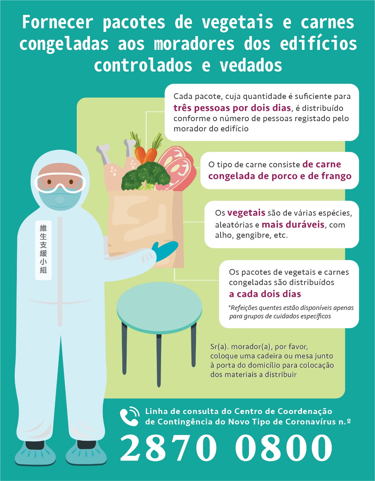 Para mais esclarecimentos sobre as medidas de prevenção e controlo, queira ligar para a linha aberta (28700800) do Centro de Coordenação de Contingência do Novo Tipo de Coronavírus.