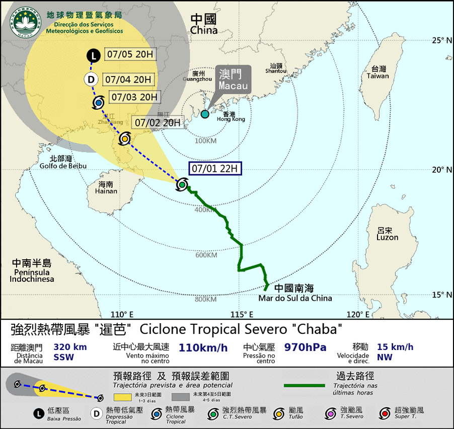 O sinal n.o 8 de tempestade tropical está em vigor. É esperado que o ciclone tropical severo “Chaba” ainda se intensifique para um tufão e se desloque para Noroeste, geralmente em direcção a costa oeste de Guangdong. Entre a noite do dia 1 e a madrugada do dia 2, espera-se que o sistema cruze o ponto mais perto de Macau.