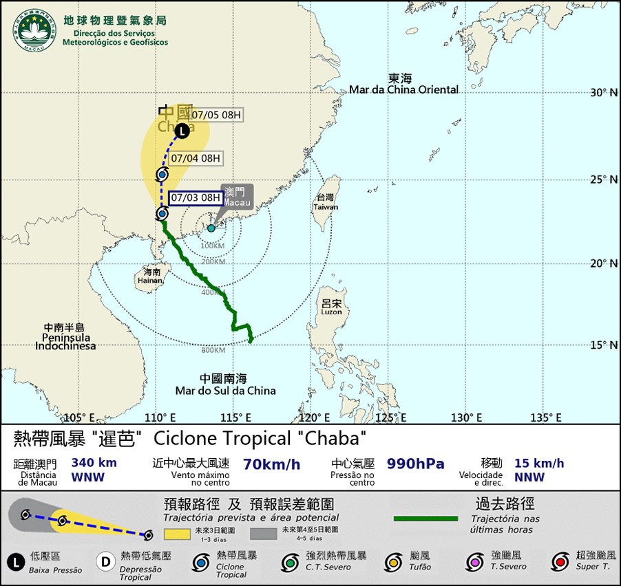 Obs: A previsão apresentada na tabela de probabilidade é uma situação que pode ocorrer nos próximos um ou dois dias. A população pode, deste modo, compreender a possibilidade e influência da tempestade tropical num determinado tempo em Macau e pode, preparar medidas preventivas necessárias, atempadamente. Aconselha-se à população que preste atenção às últimas informações divulgadas por esta direcção.