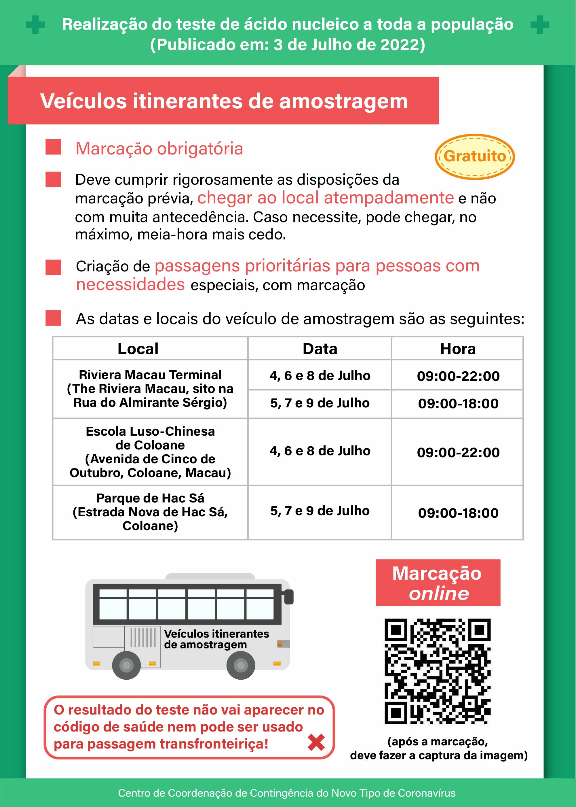 Além disso, estão disponíveis dois veículos itinerantes de amostragem, que são de marcação obrigatória. Os referidos veículos dispõem também de fila prioritária para as pessoas com necessidades especiais com marcação. As datas e locais de funcionamento destes veículos são: 1.º veículo, funciona nos dias 4, 6 e 8 de Julho, das 9h00 às 22h00, e nos dias 5, 7 e 9 de Julho, das 09h00 às 18h00, na paragem “Riviera Macau /Terminal”, situada na Rua do Almirante Sérgio, Riviera Macau; 2.º veículo, funciona nos dias 4, 6 e 8 de Julho, das 9h00 às 22h00, na Escola Luso-Chinesa de Coloane, situada na Avenida de Cinco de Outubro, Coloane e nos dias 5, 7 e 9 de Julho, das 09h00 às 18h00, no Parque de Hac Sá, situado na Estrada Nova de Hac Sá, Coloane). Solicita-se a atenção de toda a população.