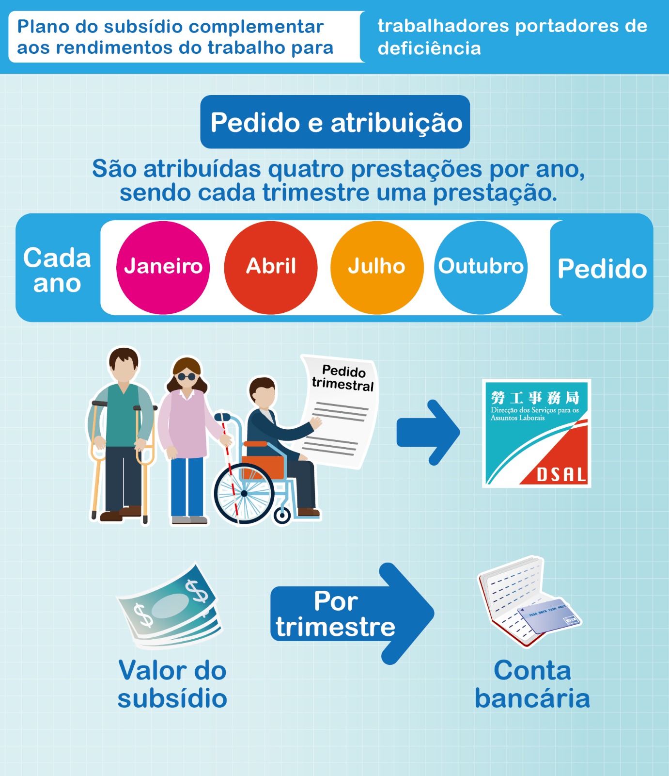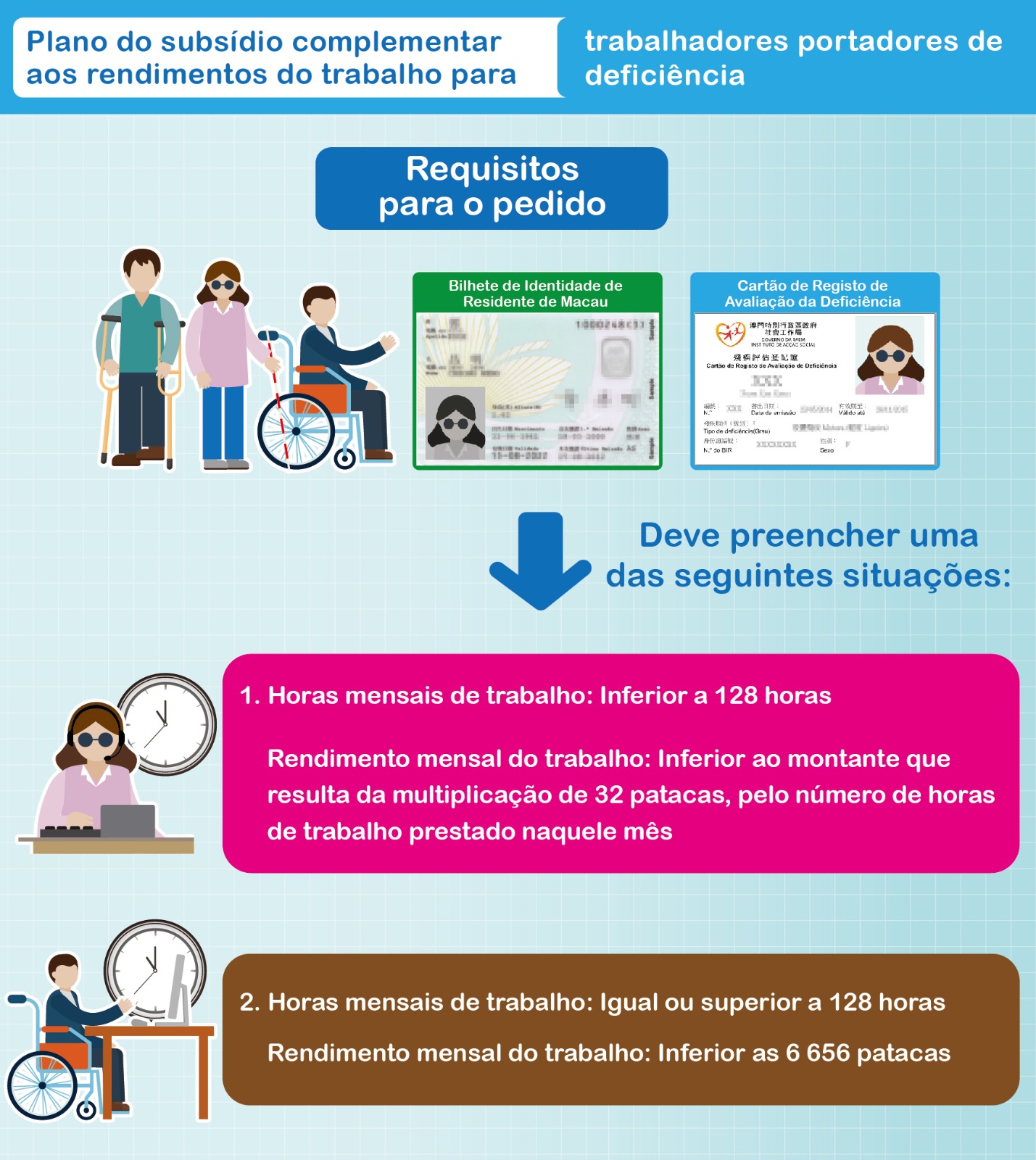 Podem requerer o subsídio todos os trabalhadores locais, portadores do Cartão válido de registo de avaliação de deficiência emitido pelo Instituto de Acção Social, cujo número total de horas de trabalho cumulativamente prestado seja inferior a 128 horas mensais e o rendimento do trabalho daquele mês seja inferior ao montante que resulta da multiplicação do valor do salário mínimo por hora (32 patacas) previsto no “Salário mínimo para os trabalhadores” pelo número de horas de trabalho efectivamente prestado naquele mês; ou cujo número total de horas de trabalho cumulativamente prestado seja igual ou superior a 128 horas mensais e o rendimento do trabalho daquele mês seja inferior ao valor do salário mínimo mensal (6 656 patacas) previsto no “Salário mínimo para os trabalhadores”. Os que preenchem os requisitos devem apresentar o pedido junto da DSAL para requerer o subsídio, acompanhado dos documentos necessários, tais como o impresso de requerimento devidamente preenchido e assinado pelo trabalhador e o seu empregador, bem como a cópia do Bilhete de Identidade de Residente de Macau, a cópia do cartão de registo de avaliação de deficiência e a cópia da página da caderneta bancária donde conste o número da conta e o nome do seu titular ou a cópia do extracto mensal (apresenta-se apenas para o 1º pedido ou para actualização de informações).