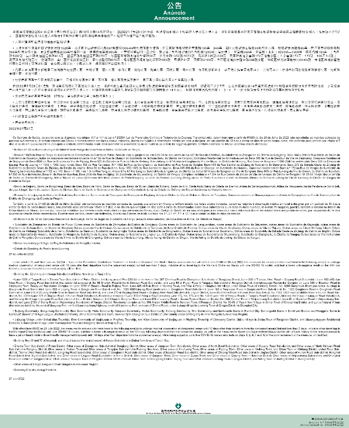 Tendo em consideração a evolução epidemiológica mais actualizada no Interior da China, os Serviços de Saúde, os Serviços de Saúde, de acordo com os dispostos nos artigos 10.º e 14.º da Lei n.º 2/2004 (Lei de Prevenção, Controlo e Tratamento de Doenças Transmissíveis), determinam que a partir da 01h00 do dia 28 de Julho de 2022, todos os indivíduos que entrem ou já tenham entrado em Macau e tenham estado no local abaixo indicado, devem ser sujeitos à observação médica em local a designar, conforme exigências da autoridade sanitária, por um período de 10 dias a contar da data de saída destes locais, não podendo esse período ser inferior a 7 dias, e no dia em que complete 14 dias após a saída de determinados locais deve submeter-se a um teste de ácido nucleico, se o teste for negativo, permite, também a entrada no Interior da China através de Macau: