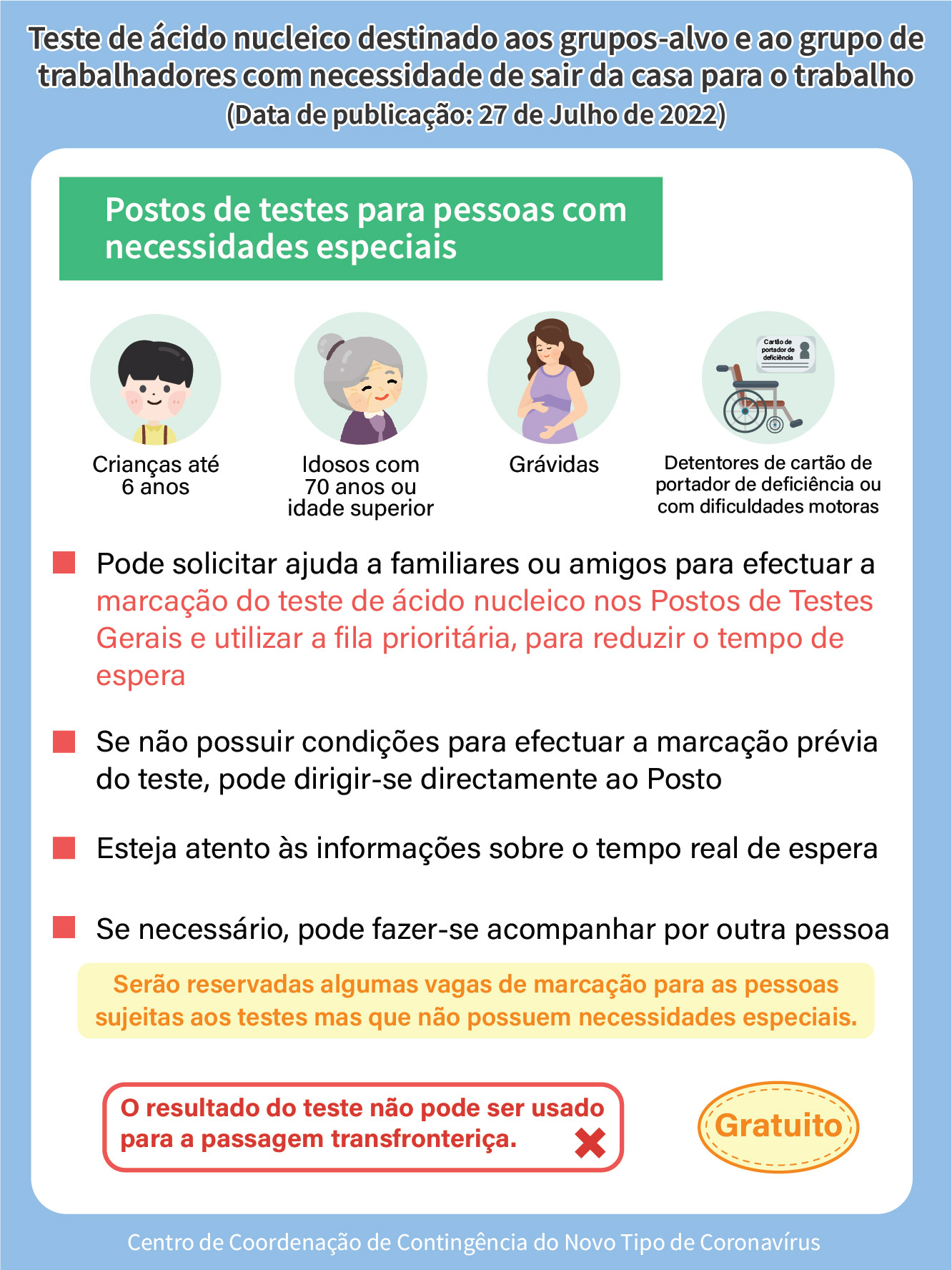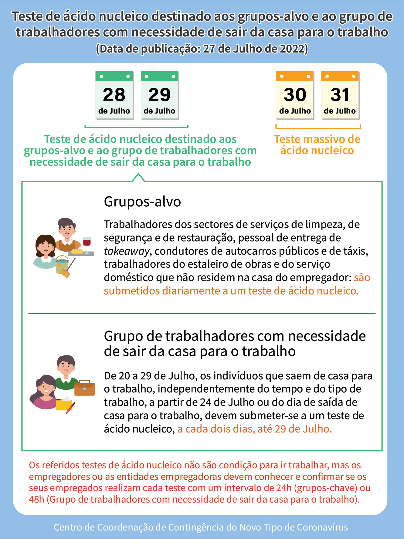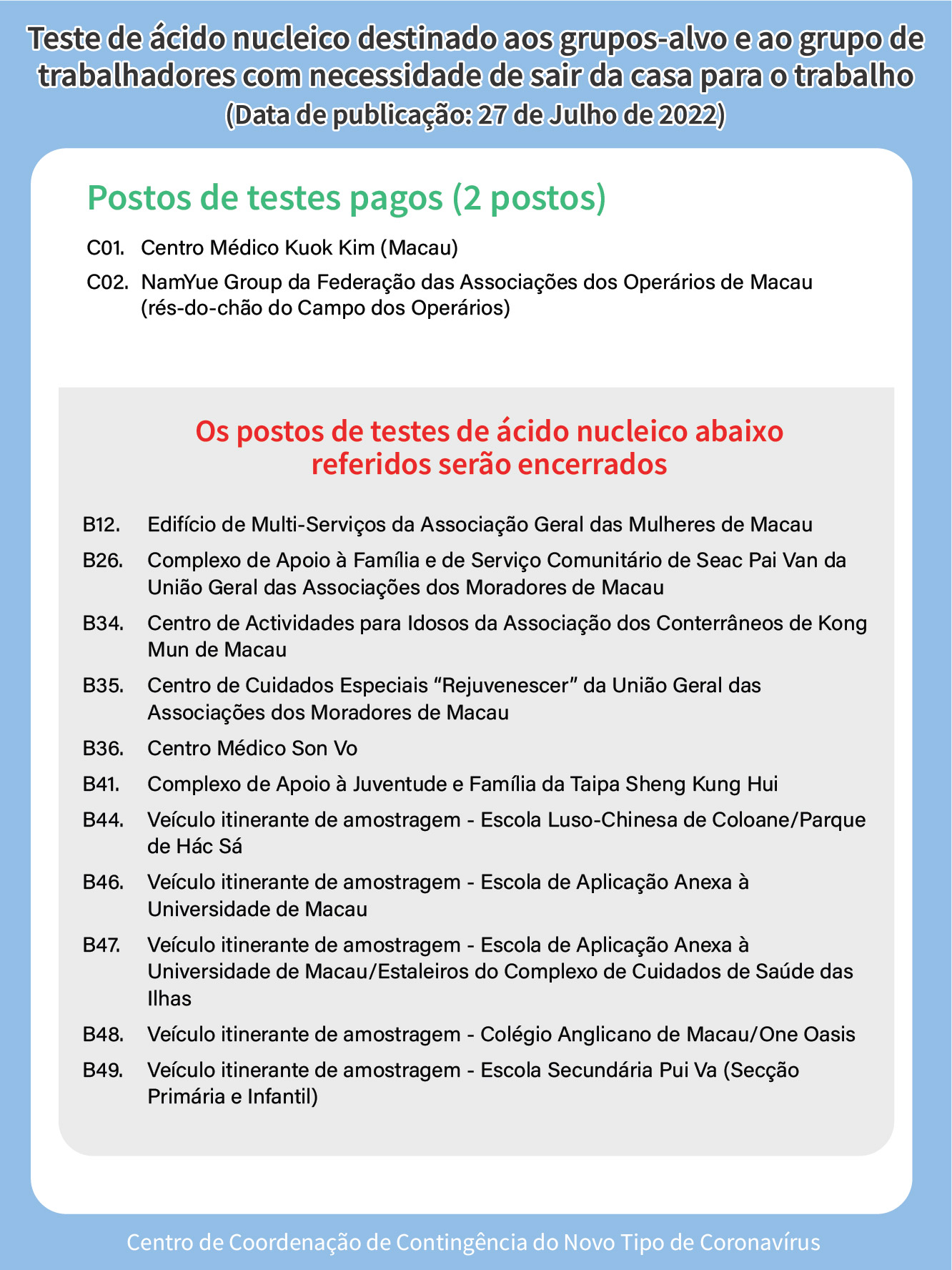 O Centro de Coordenação de Contingência do Novo Tipo de Coronavírus informou que, após revisão das necessidades de testes de ácido nucleico destinados às pessoas das áreas-chave, grupos-alvo e grupo de trabalhadores, com necessidades de sair de casa para o trabalho, o horário de funcionamento será alterado, a partir de amanhã (dia 28 de Julho), das 08h00 às 22h00, nos seguintes seis postos e um posto de testes para pessoas com necessidades especiais: