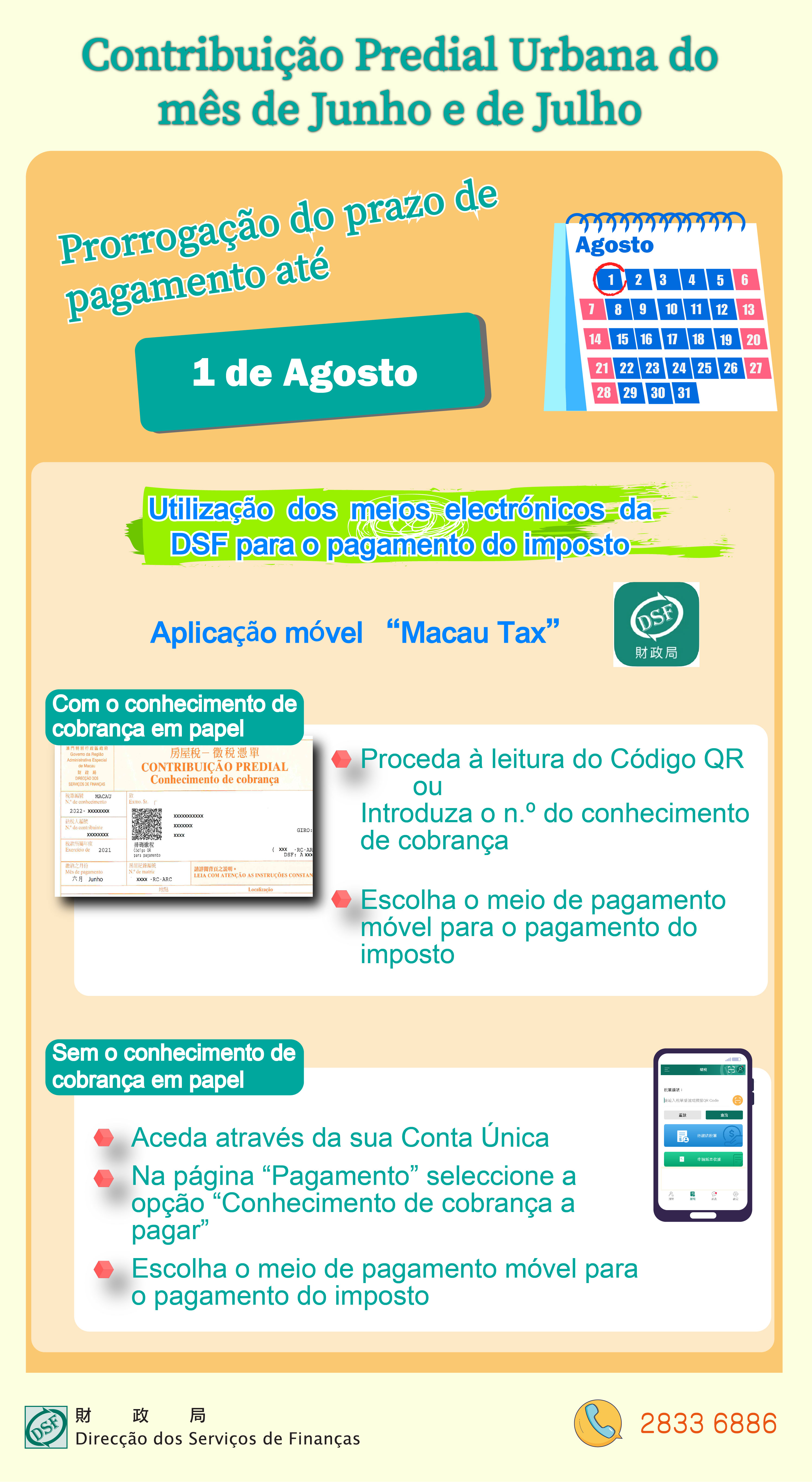 A Direcção dos Serviços de Finanças avisa os contribuintes da Contribuição Predial Urbana (CPU) com conhecimentos de cobrança referentes ao ano de 2021 e cujo mês de pagamento seja Junho, que o prazo de pagamento irá prorrogar-se até ao dia 1 de Agosto. Além disso, os conhecimentos de cobrança referentes ao ano de 2021 e cujo mês de pagamento seja Julho, o prazo de pagamento também vai até 1 de Agosto. Por forma a colaborar com as medidas anti-epidémicas do governo da RAEM e reduzir o fluxo de pessoas na comunidade, os contribuintes devem, dentro do possível, usar exclusivamente os meios electrónicos para o pagamento do imposto.